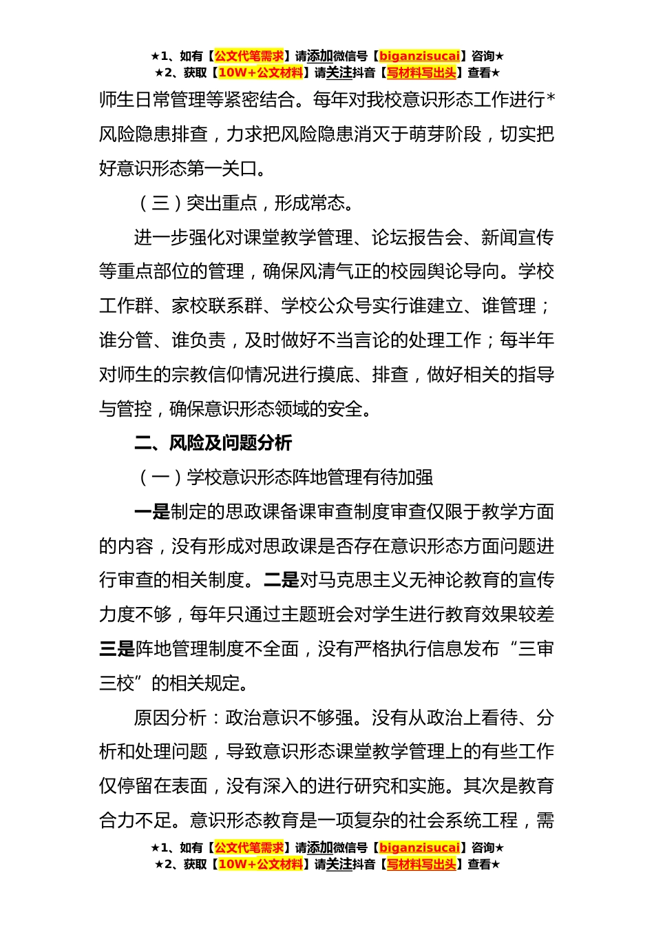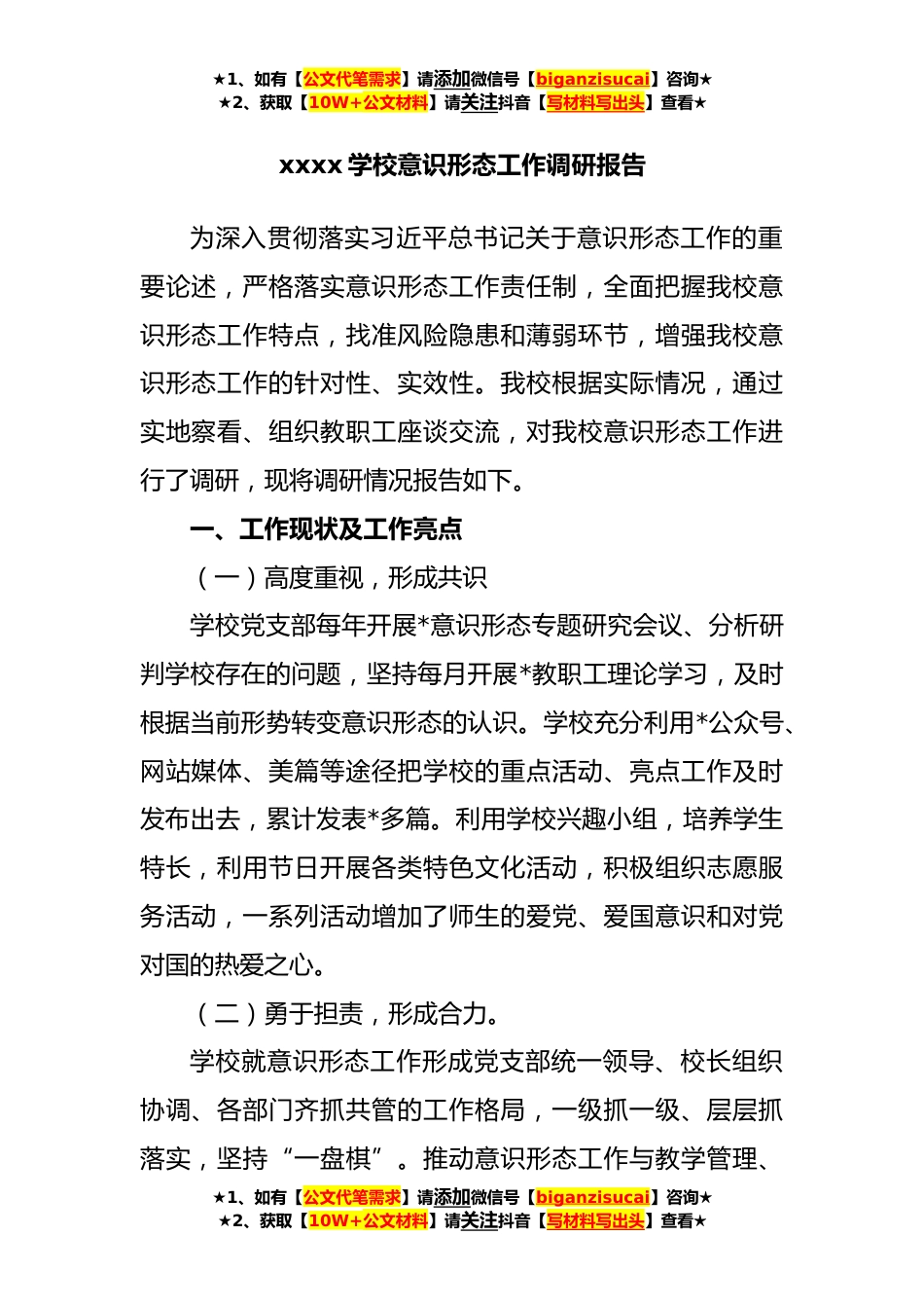 ★1、如有【公文代笔需求】请添加微信号【biganzisucai】咨询★★2、获取【10W+公文材料】请关注抖音【写材料写出头】查看★xxxx学校意识形态工作调研报告为深入贯彻落实习近平总书记关于意识形态工作的重要论述,严格落实意识形态工作责任制,全面把握我校意识形态工作特点,找准风险隐患和薄弱环节,增强我校意识形态工作的针对性、实效性。我校根据实际情况,通过实地察看、组织教职工座谈交流,对我校意识形态工作进行了调研,现将调研情况报告如下。一、工作现状及工作亮点(一)高度重视,形成共识学校党支部每年开展*意识形态专题研究会议、分析研判学校存在的问题,坚持每月开展*教职工理论学习,及时根据当前形势转变意识形态的认识。学校充分利用*公众号、网站媒体、美篇等途径把学校的重点活动、亮点工...