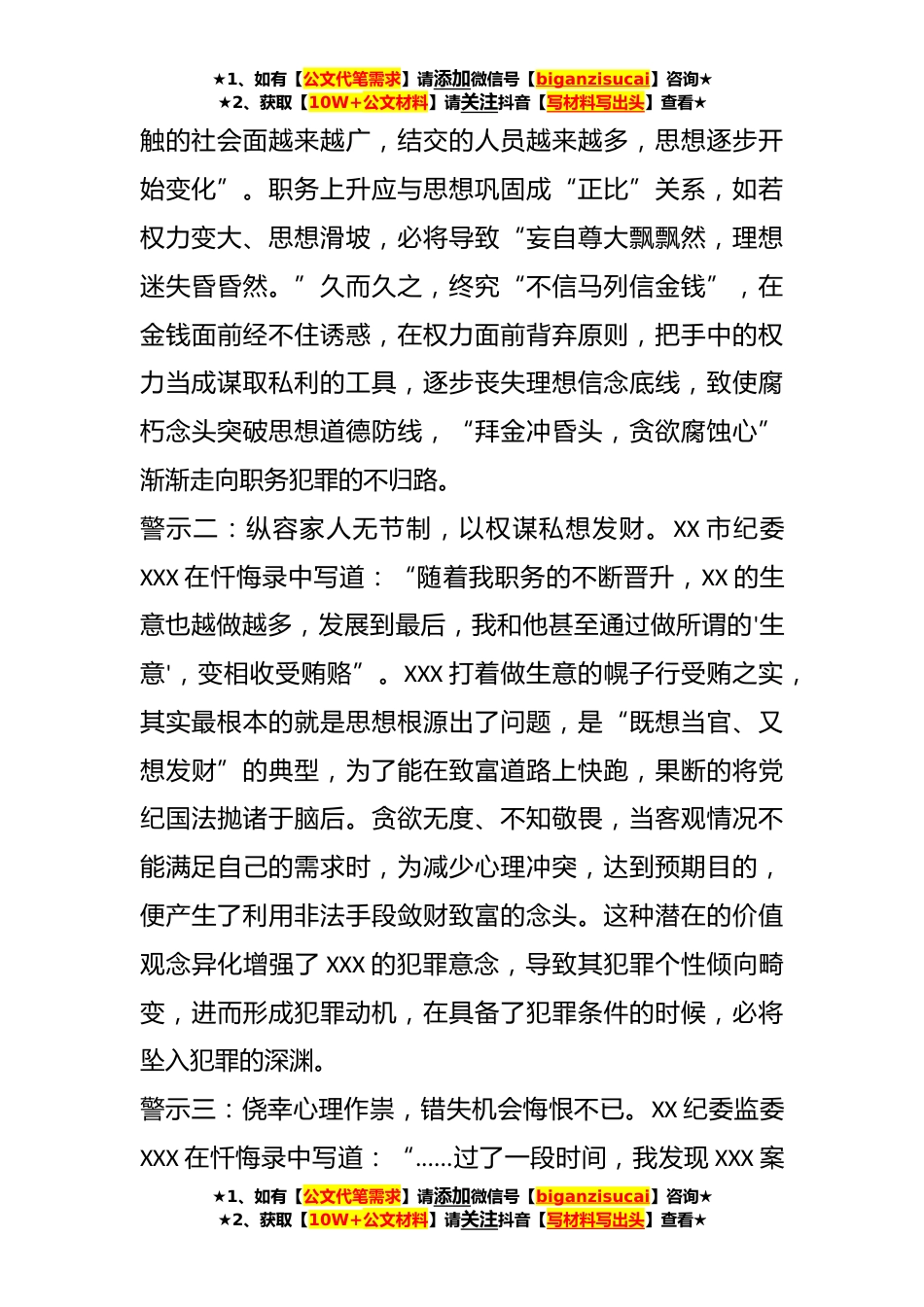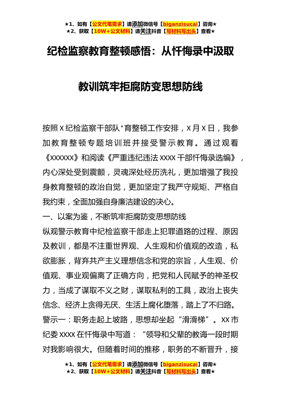 ★1、如有【公文代笔需求】请添加微信号【biganzisucai】咨询★★2、获取【10W+公文材料】请关注抖音【写材料写出头】查看★纪检监察教育整顿感悟:从忏悔录中汲取教训筑牢拒腐防变思想防线按照X纪检监察干部队*育整顿工作安排,X月X日,我参加教育整顿专题培训班并接受警示教育。通过观看《XXXXXX》和阅读《严重违纪违法XXXX干部忏悔录选编》,内心深处受到震颤,灵魂深处经历洗礼,更加增强了我投身教育整顿的政治自觉,更加坚定了我严守规矩、严格自我约束,全面加强自身廉洁建设的决心。一、以案为鉴,不断筑牢拒腐防变思想防线纵观警示教育中纪检监察干部走上犯罪道路的过程、原因及教训,都是不注重世界观、人生观和价值观的改造,私欲膨胀,背弃共产主义理想信念和党的宗旨,人生观、价值观、事业观偏离了...