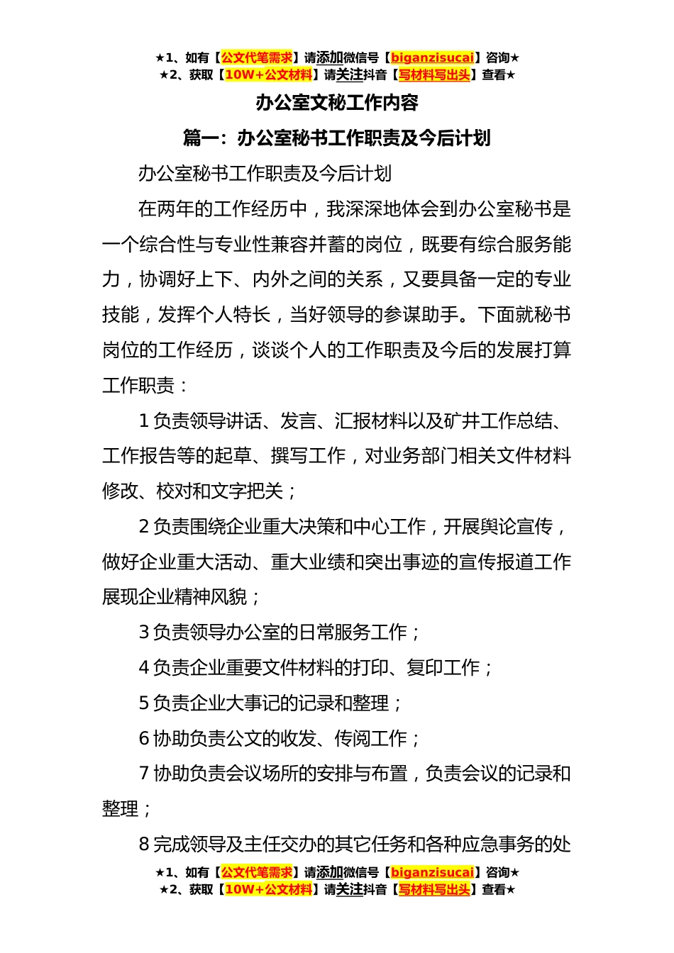 ★1、如有【公文代笔需求】请添加微信号【biganzisucai】咨询★★2、获取【10W+公文材料】请关注抖音【写材料写出头】查看★办公室文秘工作内容篇一:办公室秘书工作职责及今后计划办公室秘书工作职责及今后计划在两年的工作经历中,我深深地体会到办公室秘书是一个综合性与专业性兼容并蓄的岗位,既要有综合服务能力,协调好上下、内外之间的关系,又要具备一定的专业技能,发挥个人特长,当好领导的参谋助手。下面就秘书岗位的工作经历,谈谈个人的工作职责及今后的发展打算工作职责:1负责领导讲话、发言、汇报材料以及矿井工作总结、工作报告等的起草、撰写工作,对业务部门相关文件材料修改、校对和文字把关;2负责围绕企业重大决策和中心工作,开展舆论宣传,做好企业重大活动、重大业绩和突出事迹的宣传报...