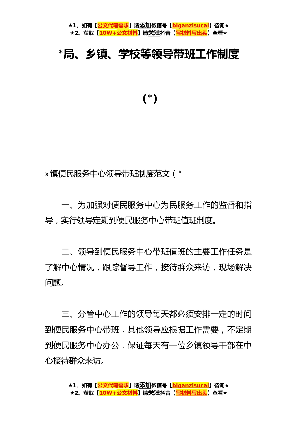 ★1、如有【公文代笔需求】请添加微信号【biganzisucai】咨询★★2、获取【10W+公文材料】请关注抖音【写材料写出头】查看★*局、乡镇、学校等领导带班工作制度(*)x镇便民服务中心领导带班制度范文(*一、为加强对便民服务中心为民服务工作的监督和指导,实行领导定期到便民服务中心带班值班制度。二、领导到便民服务中心带班值班的主要工作任务是了解中心情况,跟踪督导工作,接待群众来访,现场解决问题。三、分管中心工作的领导每天都必须安排一定的时间到便民服务中心带班,其他领导应根据工作需要,不定期到便民服务中心办公,保证每天有一位乡镇领导干部在中心接待群众来访。★1、如有【公文代笔需求】请添加微信号【biganzisucai】咨询★★2、获取【10W+公文材料】请关注抖音【写材料写出头】查看★★1、...