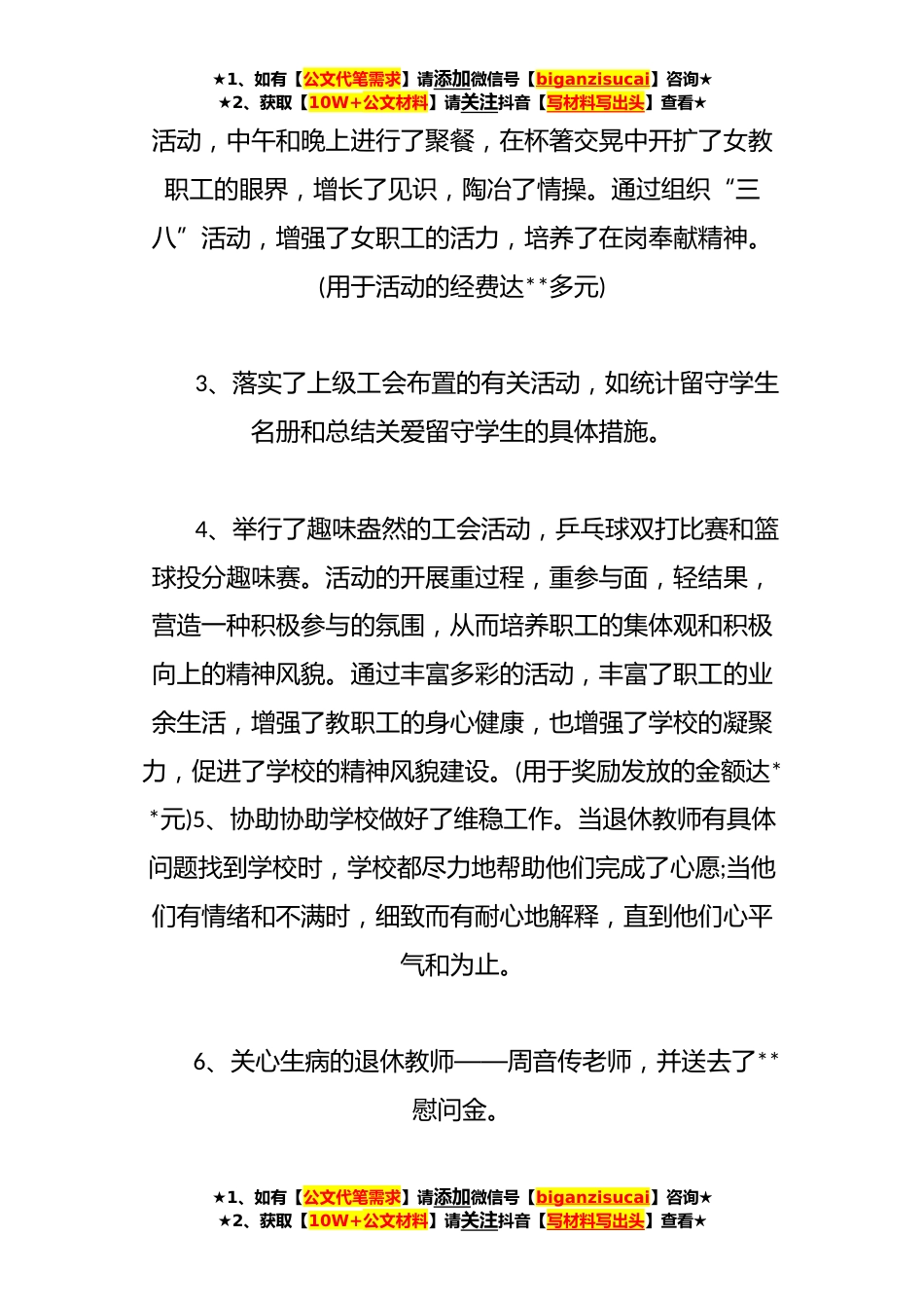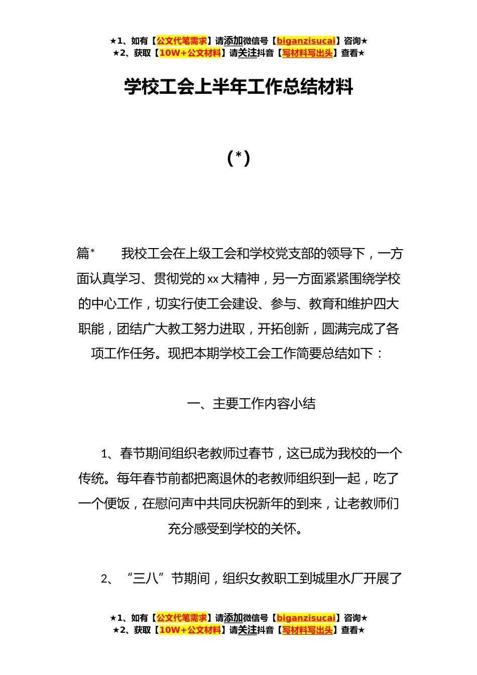 ★1、如有【公文代笔需求】请添加微信号【biganzisucai】咨询★★2、获取【10W+公文材料】请关注抖音【写材料写出头】查看★学校工会上半年工作总结材料(*)篇*我校工会在上级工会和学校党支部的领导下,一方面认真学习、贯彻党的xx大精神,另一方面紧紧围绕学校的中心工作,切实行使工会建设、参与、教育和维护四大职能,团结广大教工努力进取,开拓创新,圆满完成了各项工作任务。现把本期学校工会工作简要总结如下:一、主要工作内容小结1、春节期间组织老教师过春节,这已成为我校的一个传统。每年春节前都把离退休的老教师组织到一起,吃了一个便饭,在慰问声中共同庆祝新年的到来,让老教师们充分感受到学校的关怀。2、“三八”节期间,组织女教职工到城里水厂开展了★1、如有【公文代笔需求】请添加微信号...