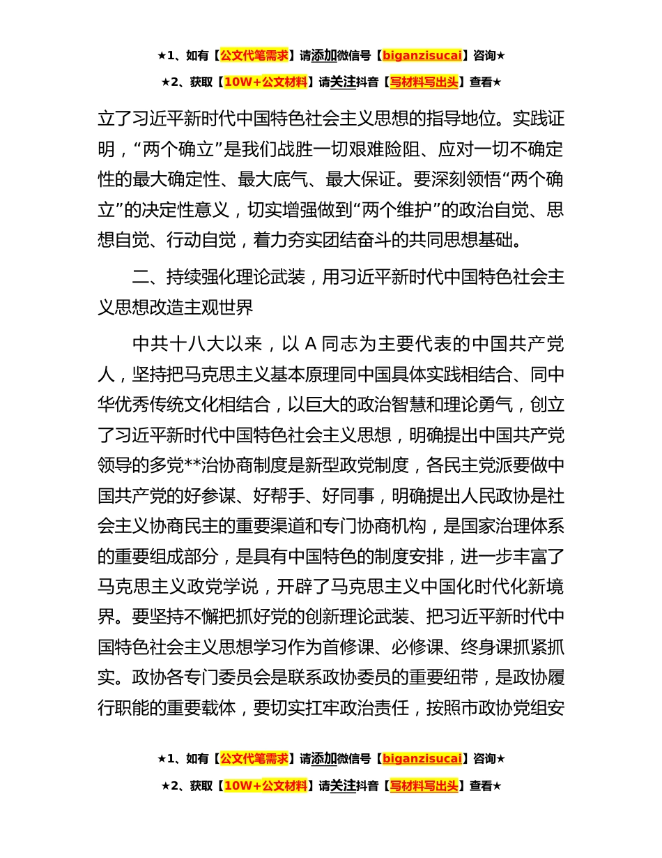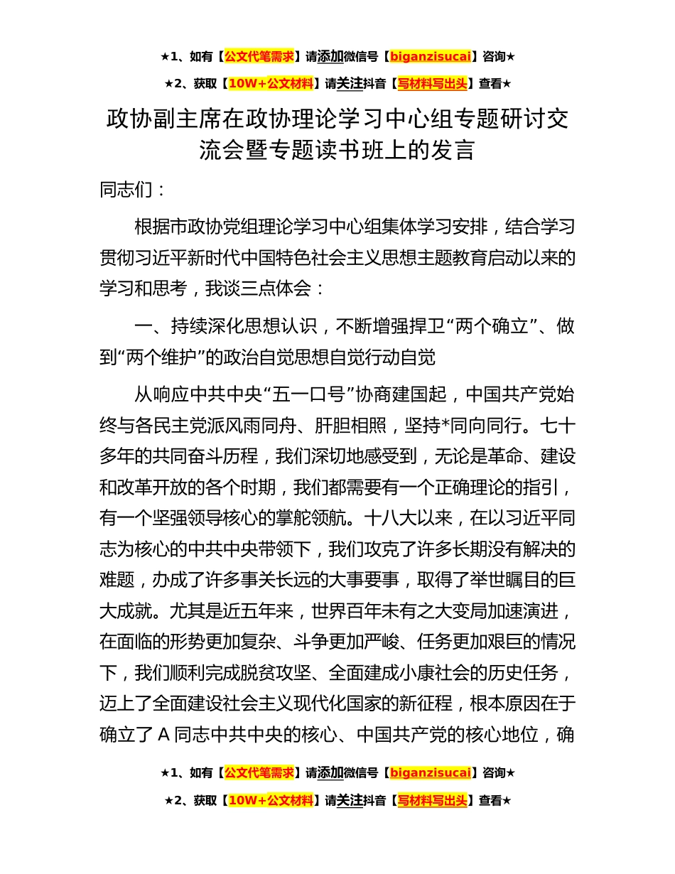 ★1、如有【公文代笔需求】请添加微信号【biganzisucai】咨询★★2、获取【10W+公文材料】请关注抖音【写材料写出头】查看★政协副主席在政协理论学习中心组专题研讨交流会暨专题读书班上的发言同志们:根据市政协党组理论学习中心组集体学习安排,结合学习贯彻习近平新时代中国特色社会主义思想主题教育启动以来的学习和思考,我谈三点体会:“”一、持续深化思想认识,不断增强捍卫两个确立、做“”到两个维护的政治自觉思想自觉行动自觉“”从响应中共中央五一口号协商建国起,中国共产党始终与各民主党派风雨同舟、肝胆相照,坚持*同向同行。七十多年的共同奋斗历程,我们深切地感受到,无论是革命、建设和改革开放的各个时期,我们都需要有一个正确理论的指引,有一个坚强领导核心的掌舵领航。十八大以来,在...
