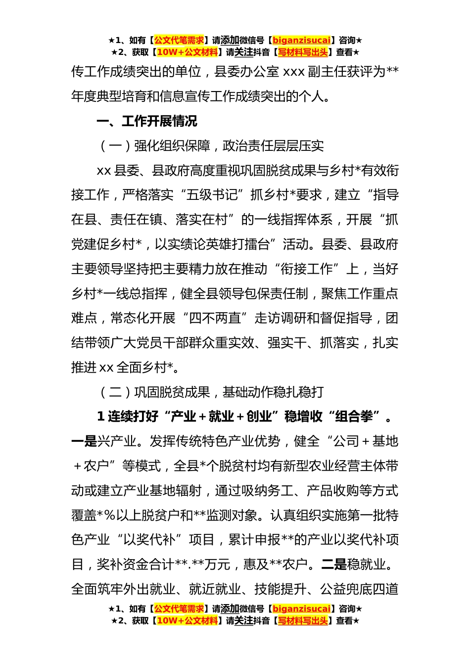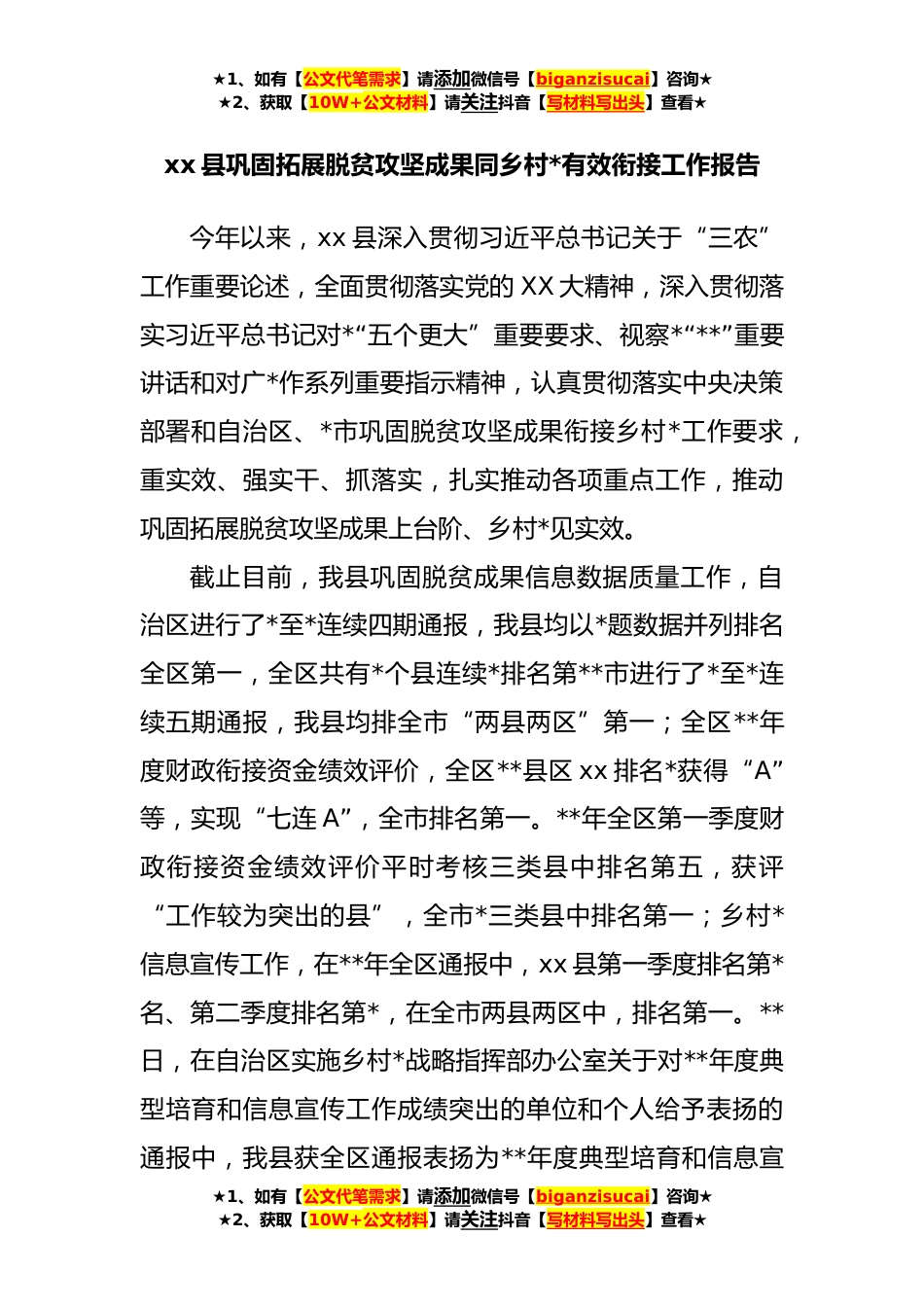 ★1、如有【公文代笔需求】请添加微信号【biganzisucai】咨询★★2、获取【10W+公文材料】请关注抖音【写材料写出头】查看★xx县巩固拓展脱贫攻坚成果同乡村*有效衔接工作报告今年以来,xx县深入贯彻习近平总书记关于“三农”工作重要论述,全面贯彻落实党的XX大精神,深入贯彻落实习近平总书记对*“五个更大”重要要求、视察*“**”重要讲话和对广*作系列重要指示精神,认真贯彻落实中央决策部署和自治区、*市巩固脱贫攻坚成果衔接乡村*工作要求,重实效、强实干、抓落实,扎实推动各项重点工作,推动巩固拓展脱贫攻坚成果上台阶、乡村*见实效。截止目前,我县巩固脱贫成果信息数据质量工作,自治区进行了*至*连续四期通报,我县均以*题数据并列排名全区第一,全区共有*个县连续*排名第**市进行了*至*连续五期通...