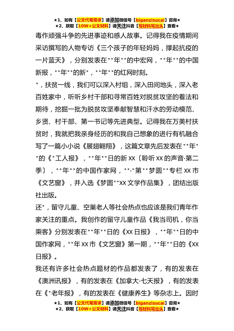★1、如有【公文代笔需求】请添加微信号【biganzisucai】咨询★★2、获取【10W+公文材料】请关注抖音【写材料写出头】查看★*后青年作家在座谈会上的发言尊敬的X主席、各位老师和亲爱的青年作家们:大家上午好!今天,我很荣幸能坐在这里参加*后青年作家座谈会,与各位共同探讨文学创作的话题。首先,非常感谢X县作协给我们*后的作家们提供这样一个难得的学习和交流的平台。下面,我结合自身实际,谈谈对写作的几点体会。第一,写作要顺应时代的潮流。**,习近平总书记在*出席文化传承发展座谈会并发表重要讲话。他指出,在新的起点上继续推动文化繁荣、建设文化强国、建设中华民族现代文明,是我们在新时代新的文化使命。作为*后青年作家的我们,在X县本土作家群中扮演着重要的角色,肩上担负着重要的历史使命和...