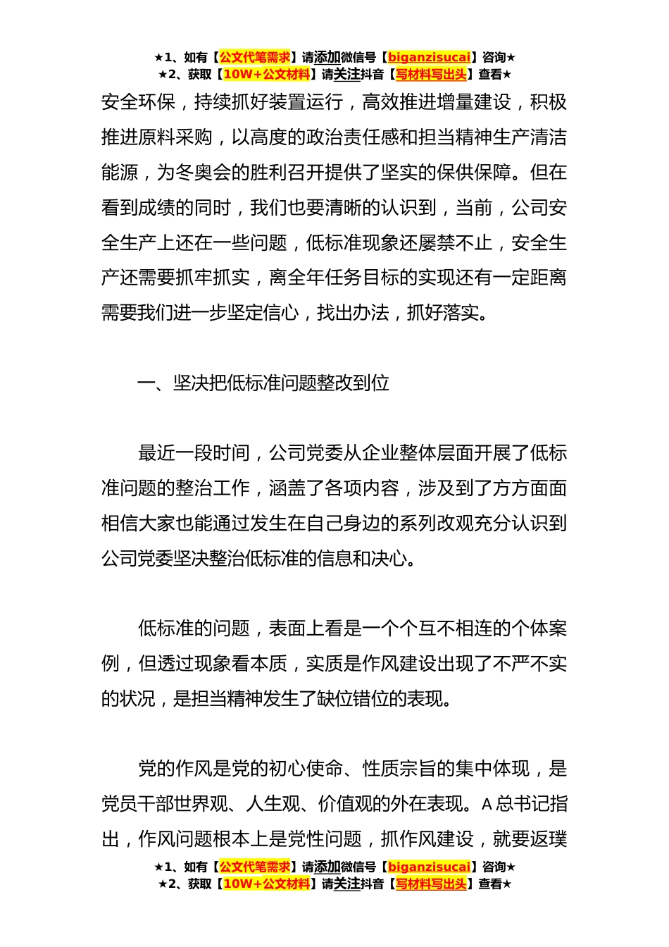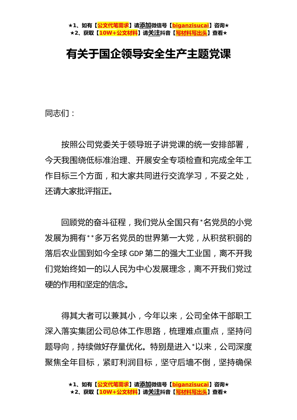 ★1、如有【公文代笔需求】请添加微信号【biganzisucai】咨询★★2、获取【10W+公文材料】请关注抖音【写材料写出头】查看★有关于国企领导安全生产主题党课同志们:按照公司党委关于领导班子讲党课的统一安排部署,今天我围绕低标准治理、开展安全专项检查和完成全年工作目标三个方面,和大家共同进行交流学习,不妥之处,还请大家批评指正。回顾党的奋斗征程,我们党从全国只有*名党员的小党发展为拥有**多万名党员的世界第一大党,从积贫积弱的落后农业国到如今全球GDP第二的强大工业国,离不开我们党始终如一的以人民为中心发展理念,离不开我们党过硬的作用和坚定的信念。得其大者可以兼其小,今年以来,公司全体干部职工深入落实集团公司总体工作思路,梳理难点重点,坚持问题导向,持续做好存量优化。特别...