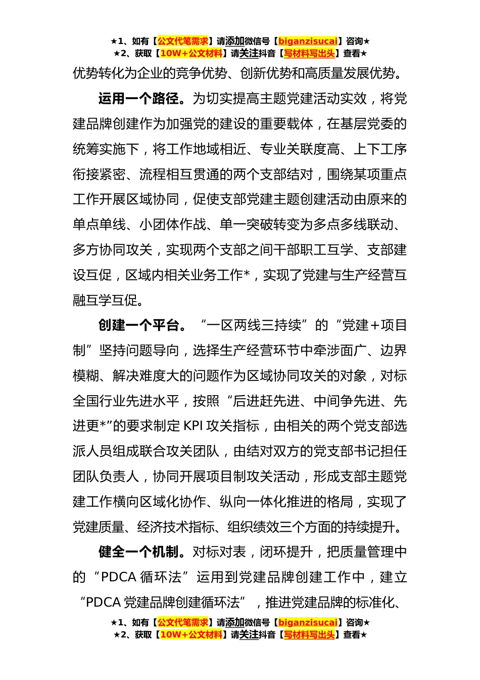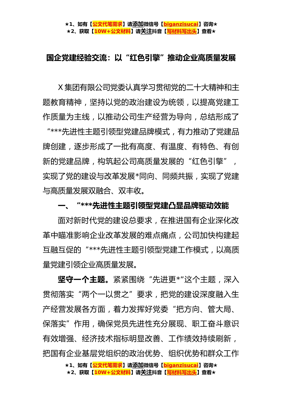 ★1、如有【公文代笔需求】请添加微信号【biganzisucai】咨询★★2、获取【10W+公文材料】请关注抖音【写材料写出头】查看★国企党建经验交流:以“红色引擎”推动企业高质量发展X集团有限公司党委认真学习贯彻党的二十大精神和主题教育精神,坚持以党的政治建设为统领,以提高党建工作质量为主线,以推动公司生产经营为导向,总结形成了“***先进性主题引领型党建品牌模式,有力推动了党建品牌创建,逐步形成了一批有高度、有温度、有特色、有创新的党建品牌,构筑起公司高质量发展的“红色引擎”,实现了党的建设与改革发展*同向、同频共振,实现了党建与高质量发展双融合、双丰收。一、“***先进性主题引领型党建凸显品牌驱动效能面对新时代党的建设总要求,在推进国有企业深化改革中瞄准影响企业改革发展的难...