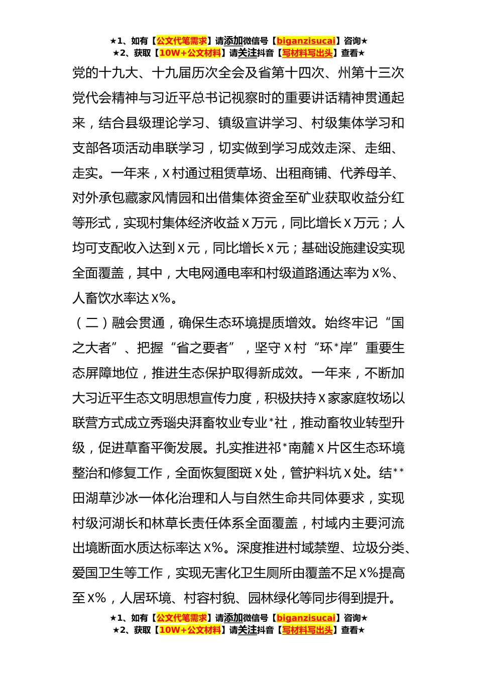 ★1、如有【公文代笔需求】请添加微信号【biganzisucai】咨询★★2、获取【10W+公文材料】请关注抖音【写材料写出头】查看★XX党支部书记关于乡村*工作的汇报材料X村位于X县城以北X公里处,下辖X个村民小组,共X户X人,全部为藏族,劳动力X人,村“两委”成员X人,党员X名,团员X名。全村以畜牧业为主,现有草场X万亩,经营各类牲畜X万头(只、匹)。X村始终把学习贯彻落实习近平总书记讲话精神作为推动村级各项事业高质量发展的根本遵循,通过谋划争当生态文明、乡村*、民族团结“三个先锋”和在乡村旅游、乡村治理、共同*闯出“三条新路子”,以此实现人民群众高品质生活和村级事业高质量发展,推动习近平总书记视察时的重要讲话精神落到民生发展实处、取得村级发展实效。一、工作开展情况(一)学深悟透,确保...