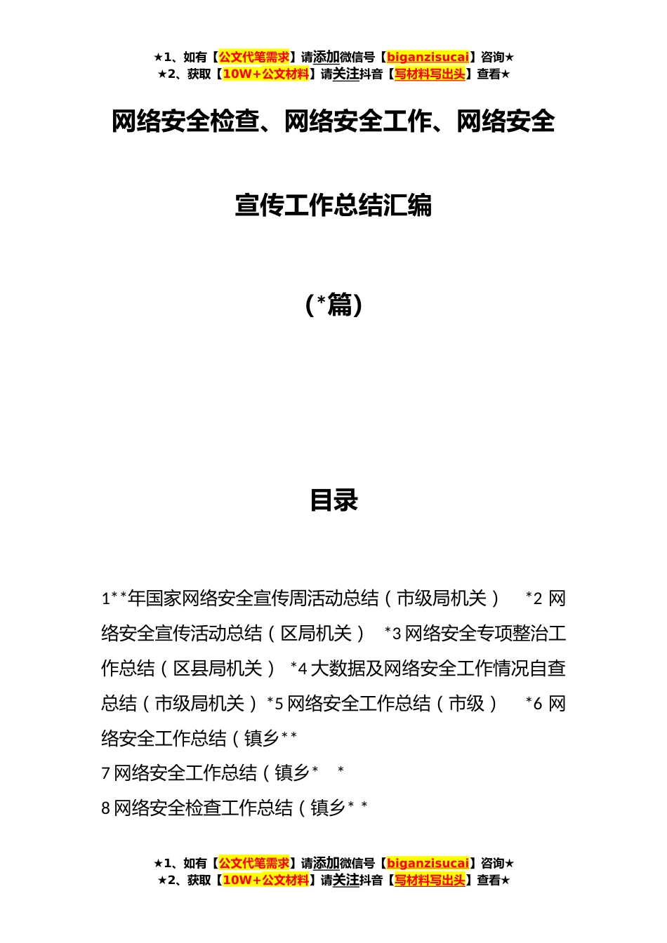 ★1、如有【公文代笔需求】请添加微信号【biganzisucai】咨询★★2、获取【10W+公文材料】请关注抖音【写材料写出头】查看★网络安全检查、网络安全工作、网络安全宣传工作总结汇编(*篇)目录1**年国家网络安全宣传周活动总结(市级局机关)*2网络安全宣传活动总结(区局机关)*3网络安全专项整治工作总结(区县局机关)*4大数据及网络安全工作情况自查总结(市级局机关)*5网络安全工作总结(市级)*6网络安全工作总结(镇乡**7网络安全工作总结(镇乡**8网络安全检查工作总结(镇乡**★1、如有【公文代笔需求】请添加微信号【biganzisucai】咨询★★2、获取【10W+公文材料】请关注抖音【写材料写出头】查看★★1、如有【公文代笔需求】请添加微信号【biganzisucai】咨询★★2、获取【10W+公文材料】请关注抖音...