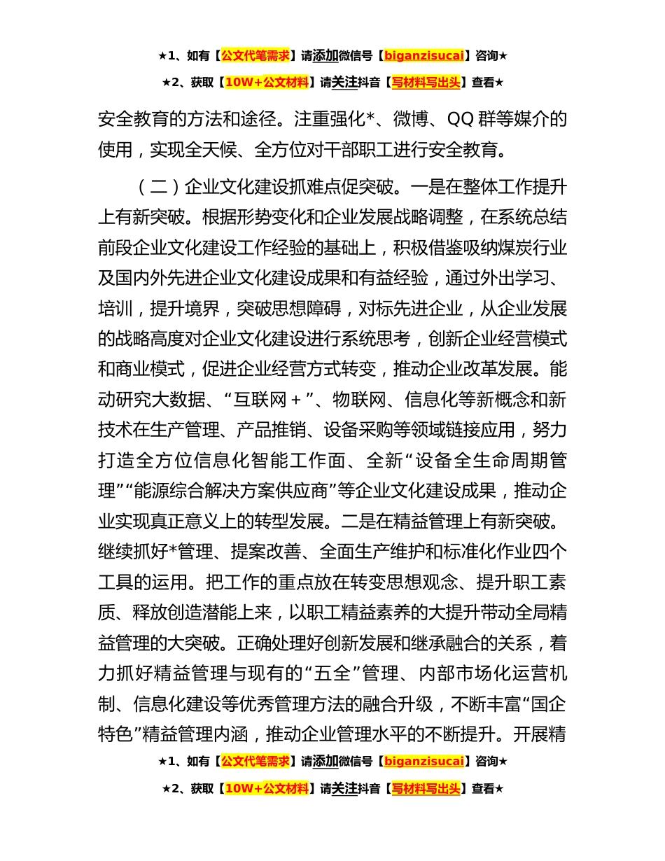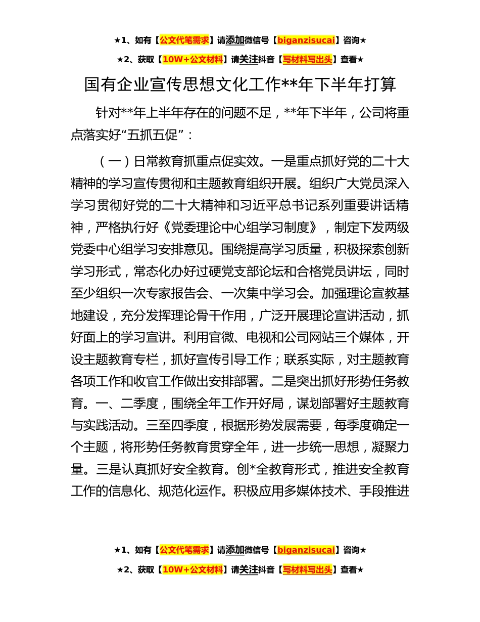 ★1、如有【公文代笔需求】请添加微信号【biganzisucai】咨询★★2、获取【10W+公文材料】请关注抖音【写材料写出头】查看★国有企业宣传思想文化工作**年下半年打算针对**年上半年存在的问题不足,**年下半年,公司将重“”点落实好五抓五促:(一)日常教育抓重点促实效。一是重点抓好党的二十大精神的学习宣传贯彻和主题教育组织开展。组织广大党员深入学习贯彻好党的二十大精神和习近平总书记系列重要讲话精神,严格执行好《党委理论中心组学习制度》,制定下发两级党委中心组学习安排意见。围绕提高学习质量,积极探索创新学习形式,常态化办好过硬党支部论坛和合格党员讲坛,同时至少组织一次专家报告会、一次集中学习会。加强理论宣教基地建设,充分发挥理论骨干作用,广泛开展理论宣讲活动,抓好面上的学...
