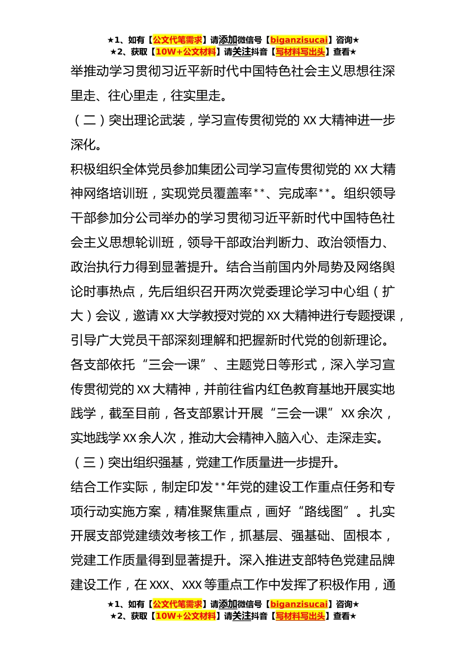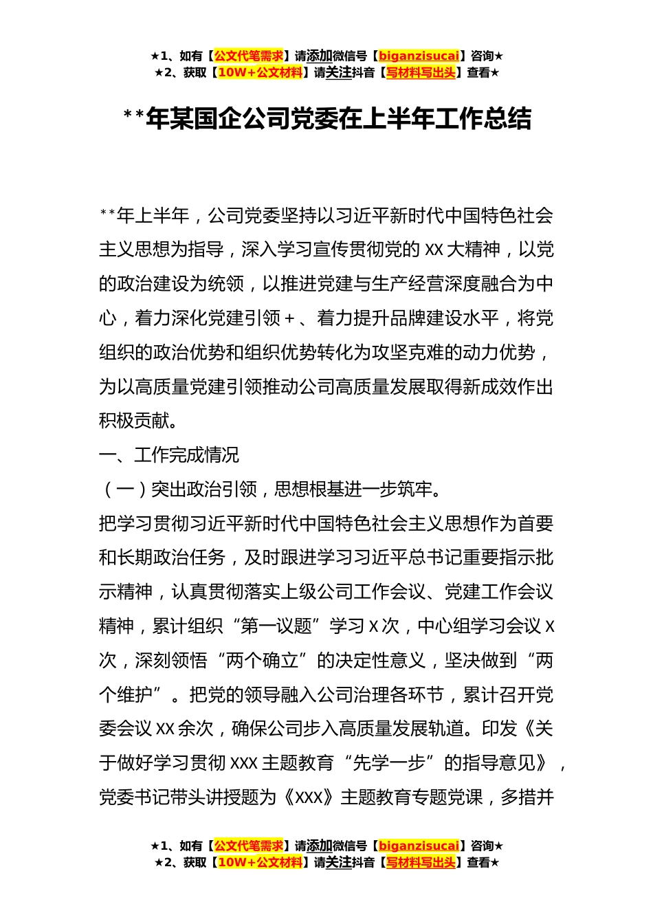 ★1、如有【公文代笔需求】请添加微信号【biganzisucai】咨询★★2、获取【10W+公文材料】请关注抖音【写材料写出头】查看★**年某国企公司党委在上半年工作总结**年上半年,公司党委坚持以习近平新时代中国特色社会主义思想为指导,深入学习宣传贯彻党的XX大精神,以党的政治建设为统领,以推进党建与生产经营深度融合为中心,着力深化党建引领+、着力提升品牌建设水平,将党组织的政治优势和组织优势转化为攻坚克难的动力优势,为以高质量党建引领推动公司高质量发展取得新成效作出积极贡献。一、工作完成情况(一)突出政治引领,思想根基进一步筑牢。把学习贯彻习近平新时代中国特色社会主义思想作为首要和长期政治任务,及时跟进学习习近平总书记重要指示批示精神,认真贯彻落实上级公司工作会议、党建工作...
