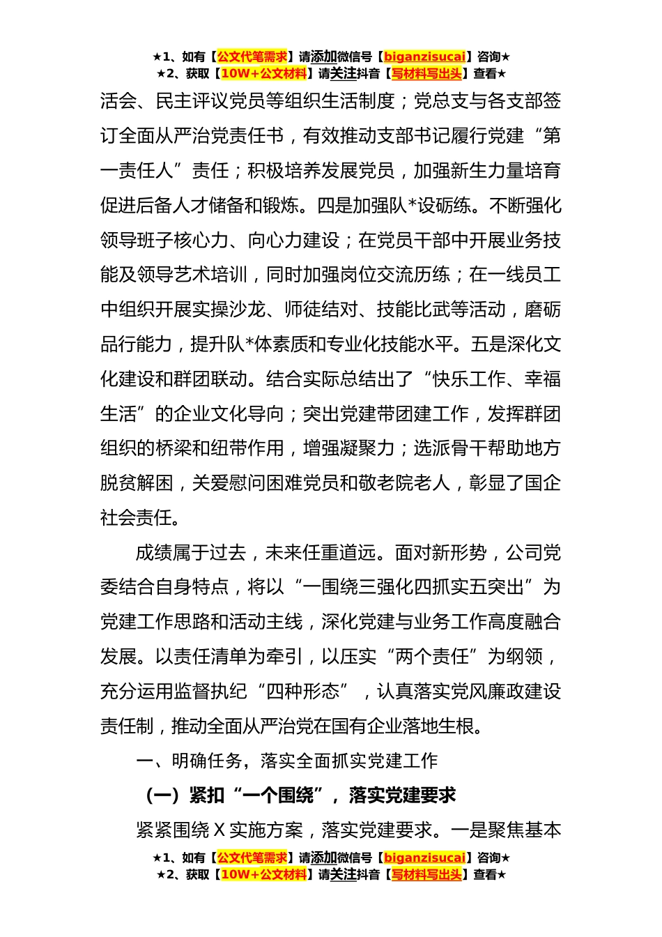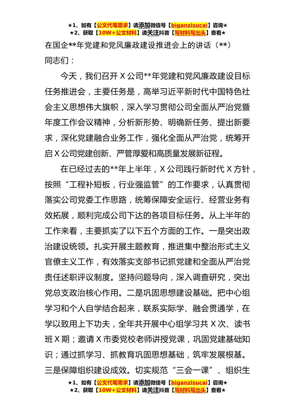★1、如有【公文代笔需求】请添加微信号【biganzisucai】咨询★★2、获取【10W+公文材料】请关注抖音【写材料写出头】查看★在国企**年党建和党风廉政建设推进会上的讲话(**)同志们:今天,我们召开X公司**年党建和党风廉政建设目标任务推进会,主要任务是,高举习近平新时代中国特色社会主义思想伟大旗帜,深入学习贯彻公司全面从严治党暨年度工作会议精神,分析新形势、明确新任务、提出新要求,深化党建融合业务工作,强化全面从严治党,统筹开启X公司党建创新、严管厚爱和高质量发展新征程。在已经过去的**年上半年,X公司践行新时代X方针,按照“工程补短板,行业强监管”的工作要求,认真贯彻落实公司党委工作思路,统筹保障安全运行、经营业务有效拓展,顺利完成公司下达的各项目标任务。从上半年的工作...