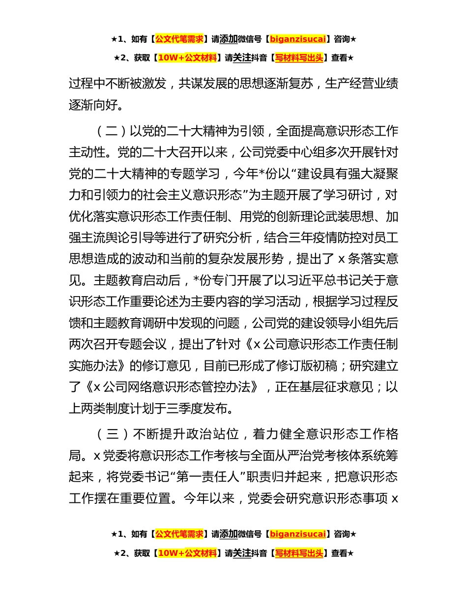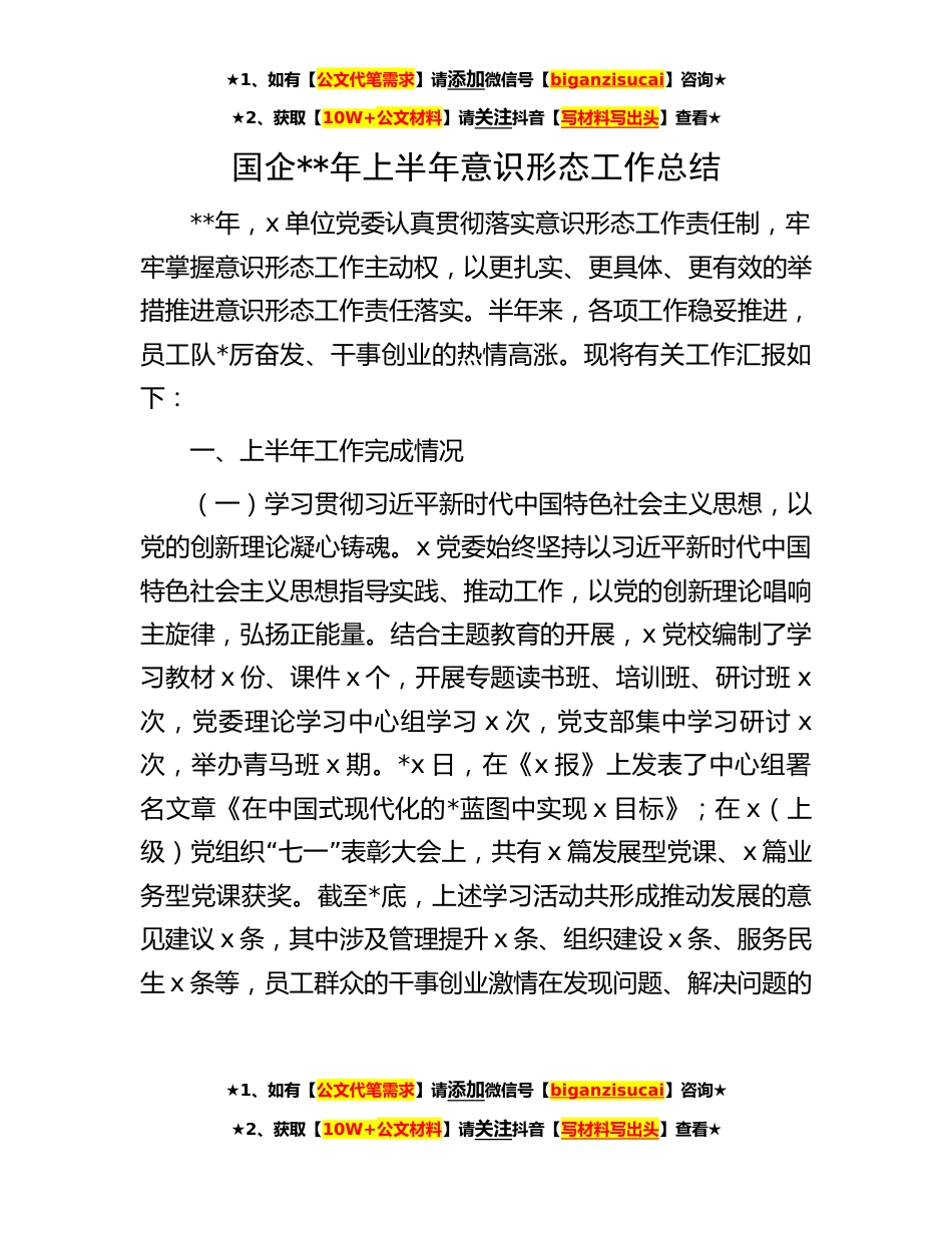 ★1、如有【公文代笔需求】请添加微信号【biganzisucai】咨询★★2、获取【10W+公文材料】请关注抖音【写材料写出头】查看★国企**年上半年意识形态工作总结**年,x单位党委认真贯彻落实意识形态工作责任制,牢牢掌握意识形态工作主动权,以更扎实、更具体、更有效的举措推进意识形态工作责任落实。半年来,各项工作稳妥推进,员工队*厉奋发、干事创业的热情高涨。现将有关工作汇报如下:一、上半年工作完成情况(一)学习贯彻习近平新时代中国特色社会主义思想,以党的创新理论凝心铸魂。x党委始终坚持以习近平新时代中国特色社会主义思想指导实践、推动工作,以党的创新理论唱响主旋律,弘扬正能量。结合主题教育的开展,x党校编制了学习教材x份、课件x个,开展专题读书班、培训班、研讨班x次,党委理论学习中心...