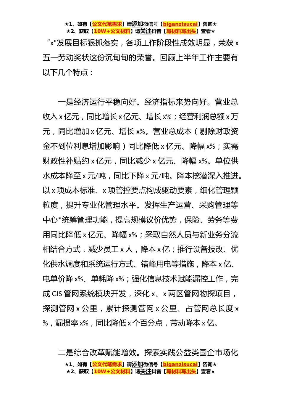 ★1、如有【公文代笔需求】请添加微信号【biganzisucai】咨询★★2、获取【10W+公文材料】请关注抖音【写材料写出头】查看★**年某集团公司上半年工作总结会议上的讲话同志们:这次工作总结会议的主要任务是,深入学习贯彻党的二十大精神,全面落实市委、市政府关于经济工作的决策部署,系统总结上半年工作,认真分析当前形势,进一步明确下半年工作任务,动员全集团广大干部群众,凝聚共识,知责奋进,奋力推动高质量发展取得新成效。下面,我讲三点意见。一、在总结成绩中增强做好下半年工作的责任感使命感今年以来,集团公司坚持以习近平新时代中国特色社会主义思想为指导,围绕深入开展主题教育工作主线,认真落实市委市政府部署要求,高效统筹发展和安全,紧盯★1、如有【公文代笔需求】请添加微信号【biganz...