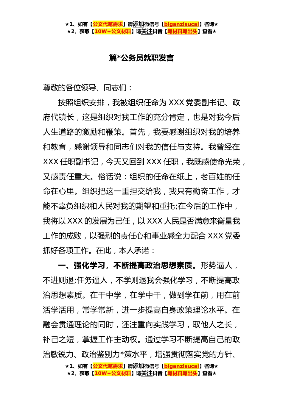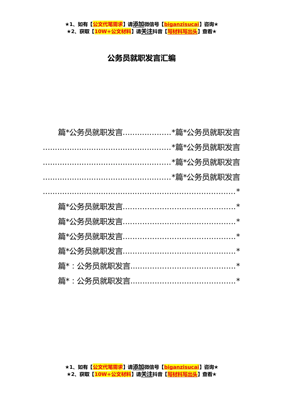 ★1、如有【公文代笔需求】请添加微信号【biganzisucai】咨询★★2、获取【10W+公文材料】请关注抖音【写材料写出头】查看★公务员就职发言汇编篇*公务员就职发言....................*篇*公务员就职发言.....................................................*篇*公务员就职发言.....................................................*篇*公务员就职发言.....................................................*篇*公务员就职发言...............................................................................*篇*公务员就职发言..............................................*篇*公务员就职发言..............................................*篇*公务员就职发言.......................................