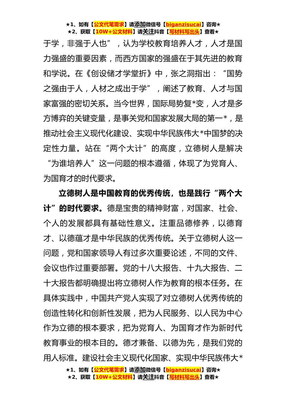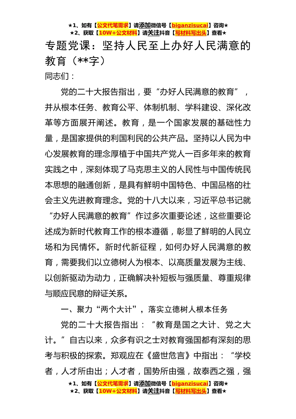 ★1、如有【公文代笔需求】请添加微信号【biganzisucai】咨询★★2、获取【10W+公文材料】请关注抖音【写材料写出头】查看★专题党课:坚持人民至上办好人民满意的教育(**字)同志们:党的二十大报告指出,要“办好人民满意的教育”,并从根本任务、教育公平、体制机制、学科建设、深化改革等方面展开阐述。教育,是一个国家发展的基础性力量,是国家提供的利国利民的公共产品。坚持以人民为中心发展教育的理念厚植于中国共产党人一百多年来的教育实践之中,深刻体现了马克思主义的人民性与中国传统民本思想的融通创新,是具有鲜明中国特色、中国品格的社会主义先进教育理念。党的十八大以来,习近平总书记就“办好人民满意的教育”作过多次重要论述,这些重要论述成为新时代教育工作的根本遵循,彰显了鲜明的人...