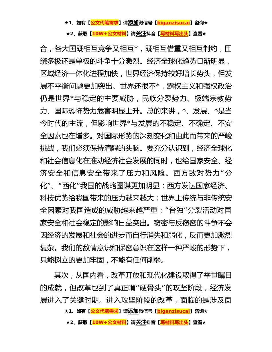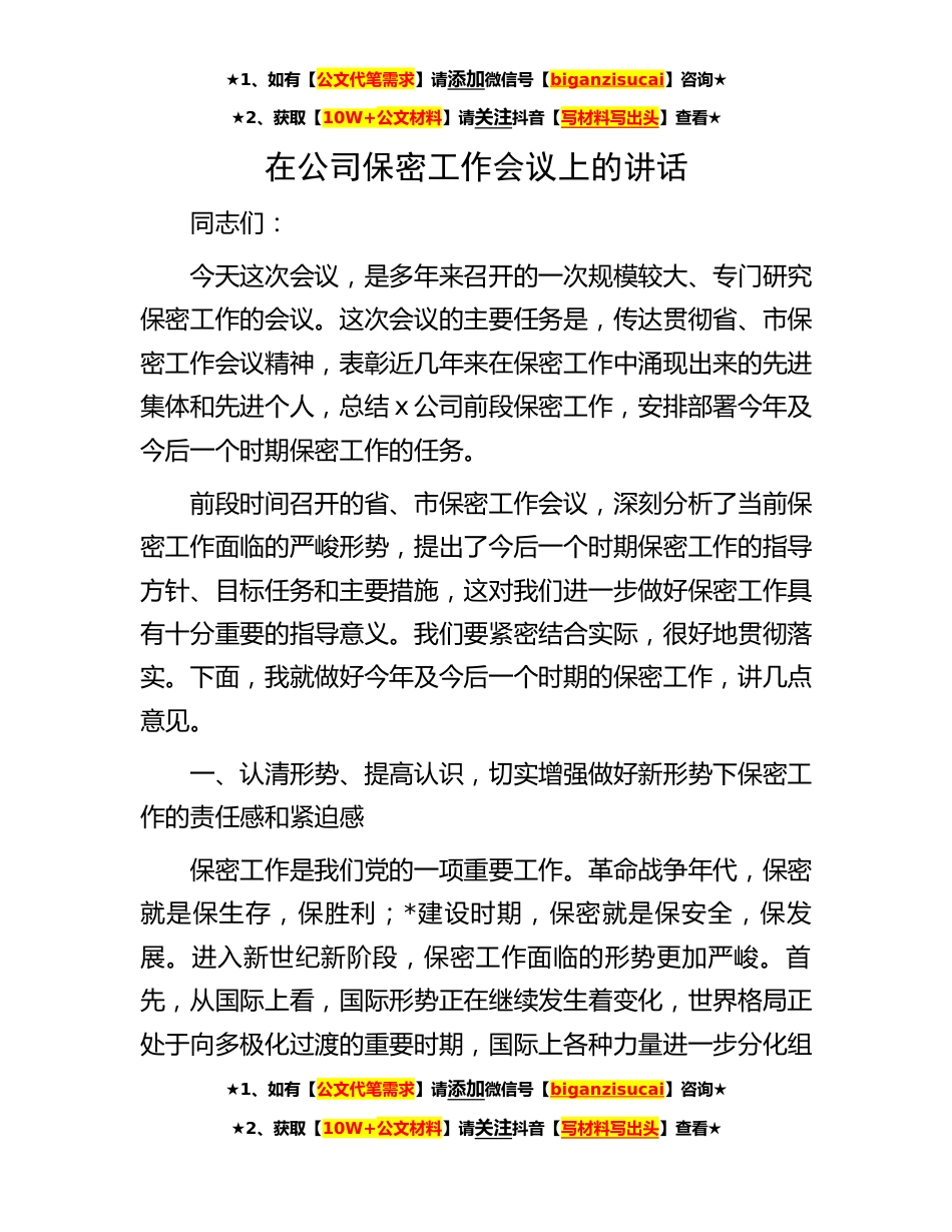 ★1、如有【公文代笔需求】请添加微信号【biganzisucai】咨询★★2、获取【10W+公文材料】请关注抖音【写材料写出头】查看★在公司保密工作会议上的讲话同志们:今天这次会议,是多年来召开的一次规模较大、专门研究保密工作的会议。这次会议的主要任务是,传达贯彻省、市保密工作会议精神,表彰近几年来在保密工作中涌现出来的先进集体和先进个人,总结x公司前段保密工作,安排部署今年及今后一个时期保密工作的任务。前段时间召开的省、市保密工作会议,深刻分析了当前保密工作面临的严峻形势,提出了今后一个时期保密工作的指导方针、目标任务和主要措施,这对我们进一步做好保密工作具有十分重要的指导意义。我们要紧密结合实际,很好地贯彻落实。下面,我就做好今年及今后一个时期的保密工作,讲几点意见。一...