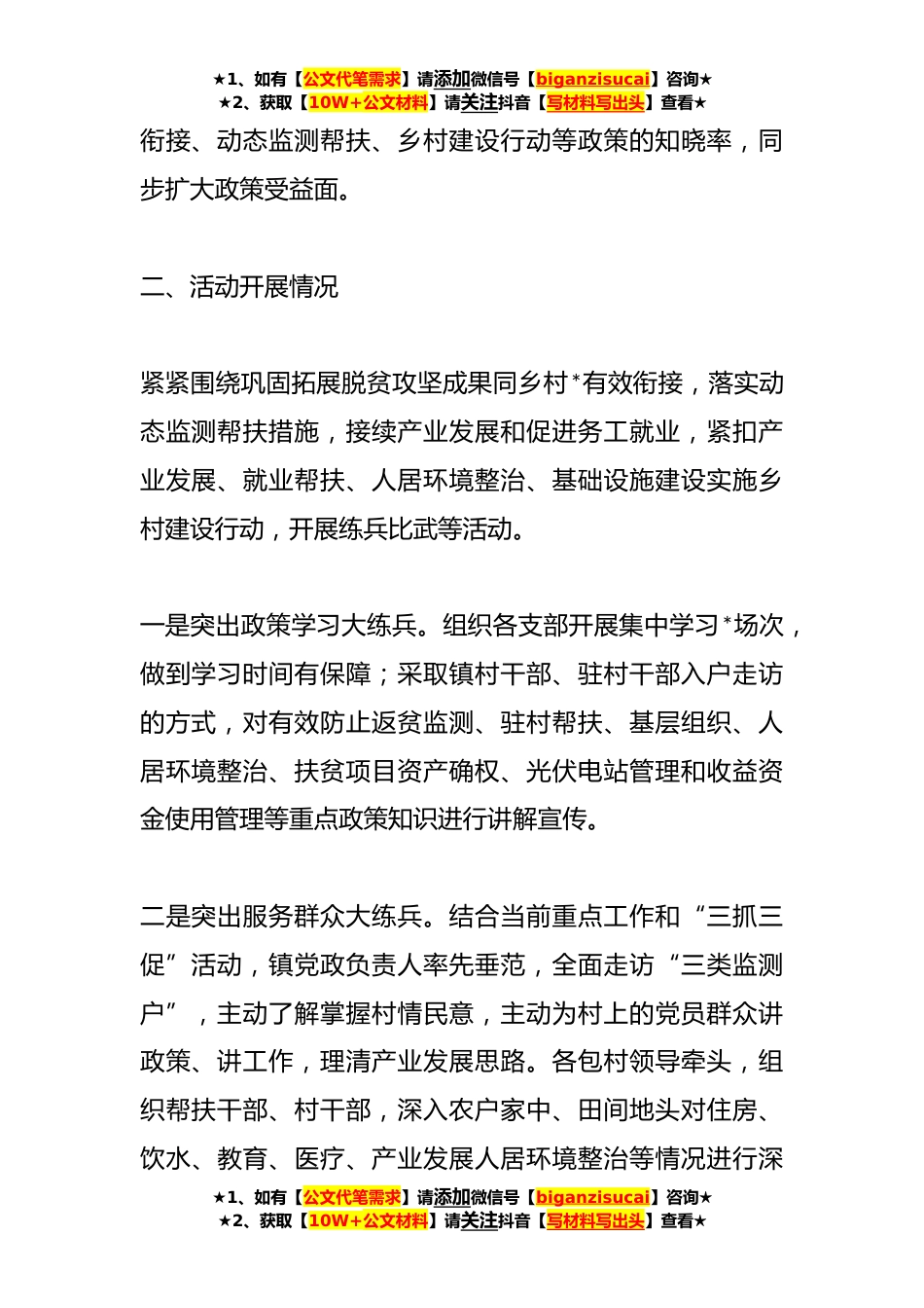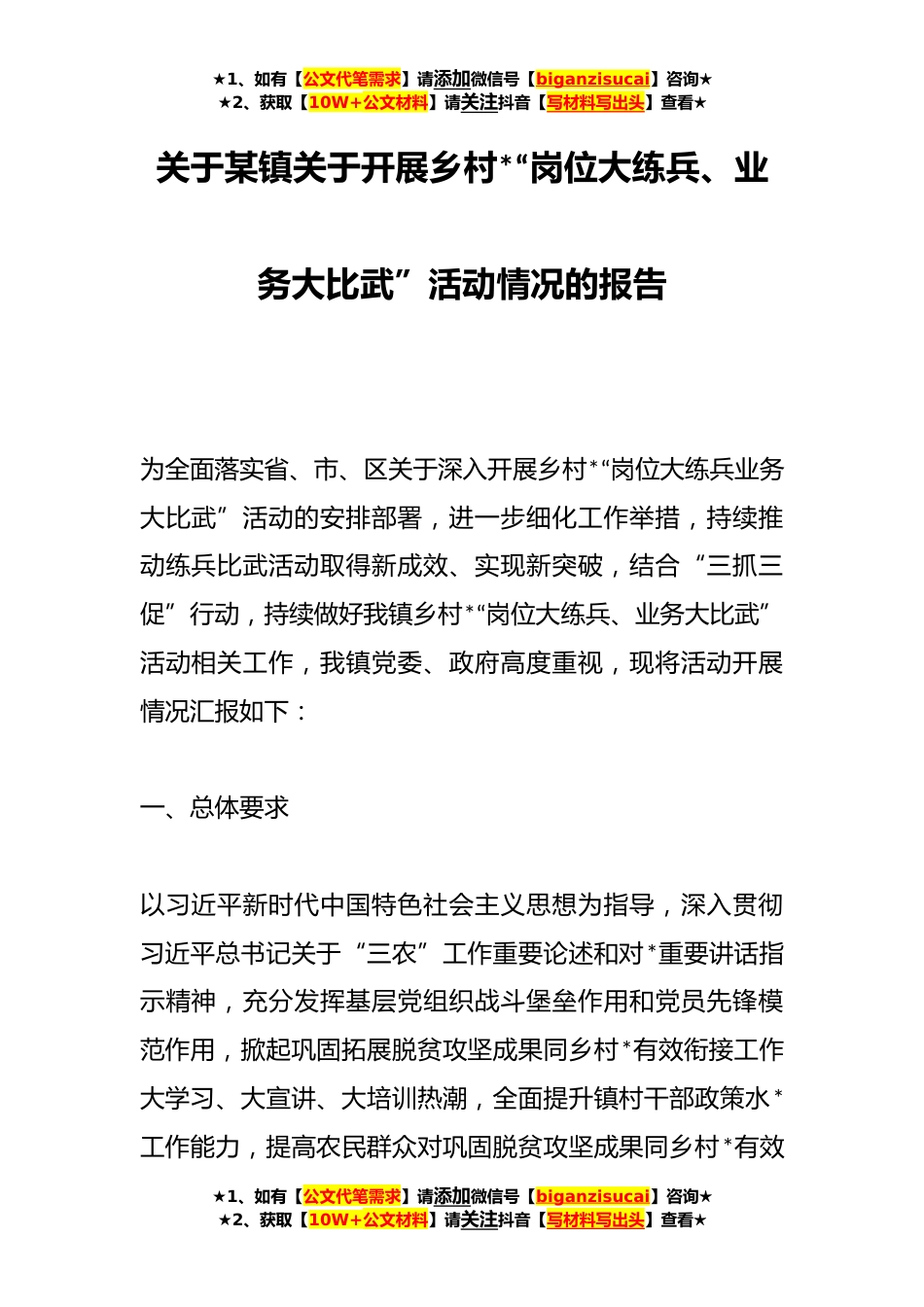 ★1、如有【公文代笔需求】请添加微信号【biganzisucai】咨询★★2、获取【10W+公文材料】请关注抖音【写材料写出头】查看★关于某镇关于开展乡村*“岗位大练兵、业务大比武”活动情况的报告为全面落实省、市、区关于深入开展乡村*“岗位大练兵业务大比武”活动的安排部署,进一步细化工作举措,持续推动练兵比武活动取得新成效、实现新突破,结合“三抓三促”行动,持续做好我镇乡村*“岗位大练兵、业务大比武”活动相关工作,我镇党委、政府高度重视,现将活动开展情况汇报如下:一、总体要求以习近平新时代中国特色社会主义思想为指导,深入贯彻习近平总书记关于“三农”工作重要论述和对*重要讲话指示精神,充分发挥基层党组织战斗堡垒作用和党员先锋模范作用,掀起巩固拓展脱贫攻坚成果同乡村*有效衔接工作大...
