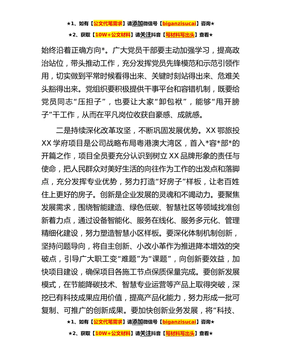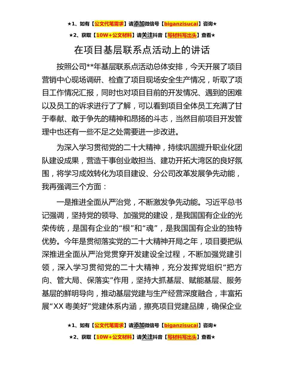 ★1、如有【公文代笔需求】请添加微信号【biganzisucai】咨询★★2、获取【10W+公文材料】请关注抖音【写材料写出头】查看★在项目基层联系点活动上的讲话按照公司**年基层联系点活动总体安排,今天开展了项目营销中心现场调研、检查了项目现场安全生产情况,听取了项目工作情况汇报,同时也对项目目前的开发情况、遇到的困难以及员工的诉求进行了了解,可以看到项目全体员工充满了甘于奉献、敢于争先的精神和昂扬的斗志,当然目前项目开发管理中也还有一些不足之处需要进一步改进。为深入学习贯彻党的二十大精神,持续巩固提升职业化团队建设成果,营造干事创业敢担当、建功开拓大湾区的良好氛围,将学习成效转化为项目建设、分公司改革发展争先动能,我再强调三个方面:一是推进全面从严治党,不断激发争先动能...