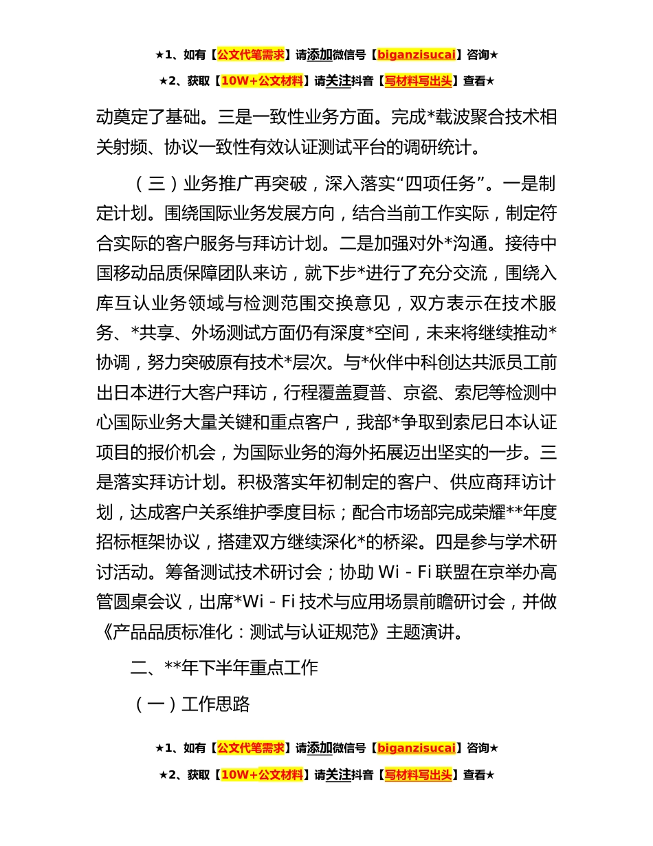 ★1、如有【公文代笔需求】请添加微信号【biganzisucai】咨询★★2、获取【10W+公文材料】请关注抖音【写材料写出头】查看★今年以来,x紧紧围绕检测中心工作部署,扎实推动各项工作向纵深推进,取得了一定成效,现将情况汇报如下:一、**年上半年完成的重点工作情况“”(一)振奋精神抢开局,实现收入两个提升。疫情防控政策放开,x不等不靠、提前部署,以开局即冲刺的态度,全力以赴推动业务工作。上半年共执行国际认证项目**个,较去年同期增长x%。同时,及时应对国内手机企业出货量持续下滑的挑战,主动开拓市场、向外突破,短距、法规和一致性业务分别增长了x%、x%、x%。Wi-Fi认证数量持续处在全球领先地位。“”(二)国际业务新发展,强化提升三项能力。聚焦法规、短距、一致性三项业务求突破。一是...