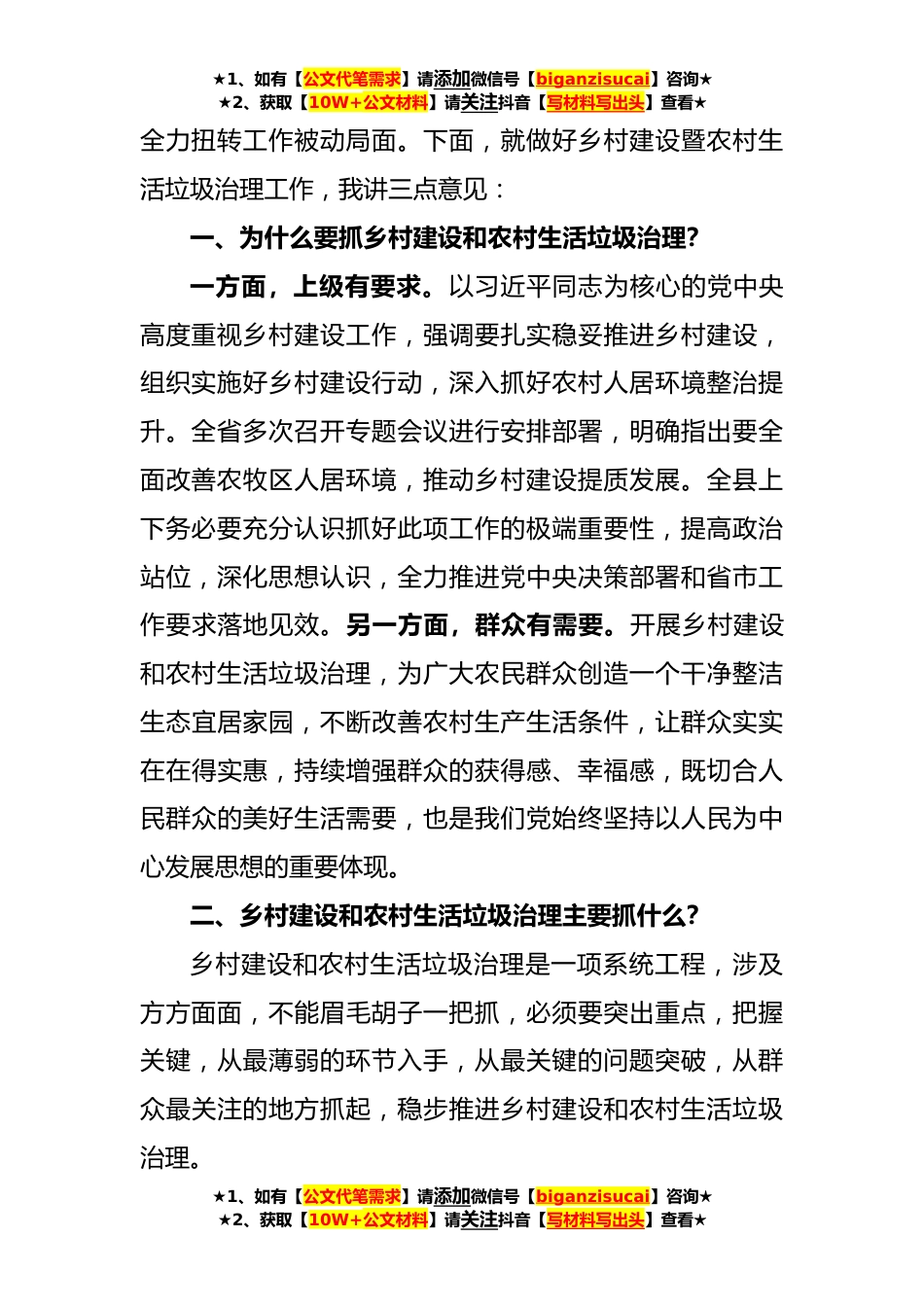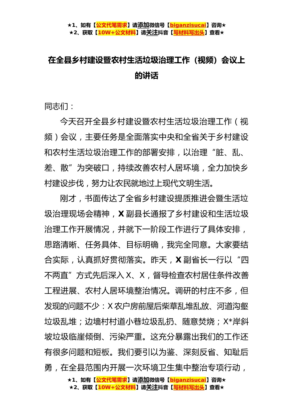 ★1、如有【公文代笔需求】请添加微信号【biganzisucai】咨询★★2、获取【10W+公文材料】请关注抖音【写材料写出头】查看★在全县乡村建设暨农村生活垃圾治理工作(视频)会议上的讲话同志们:今天召开全县乡村建设暨农村生活垃圾治理工作(视频)会议,主要任务是全面落实中央和全省关于乡村建设和农村生活垃圾治理工作的部署安排,以治理“脏、乱、差、散”为突破口,持续改善农村人居环境,全力加快乡村建设步伐,努力让农民就地过上现代文明生活。刚才,书面传达了全省乡村建设提质推进会暨生活垃圾治理现场会精神,X副县长通报了乡村建设和生活垃圾治理工作开展情况,并就下一阶段工作进行了具体安排,思路清晰、任务具体、目标明确,我完全同意。大家要结合实际,认真抓好贯彻落实。昨天,X副省长一行以“...