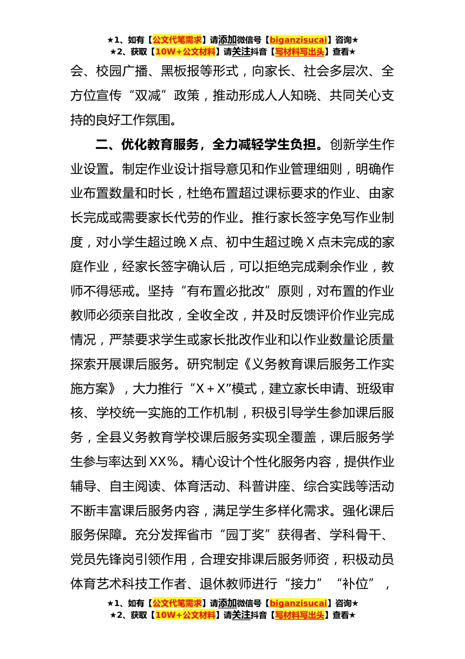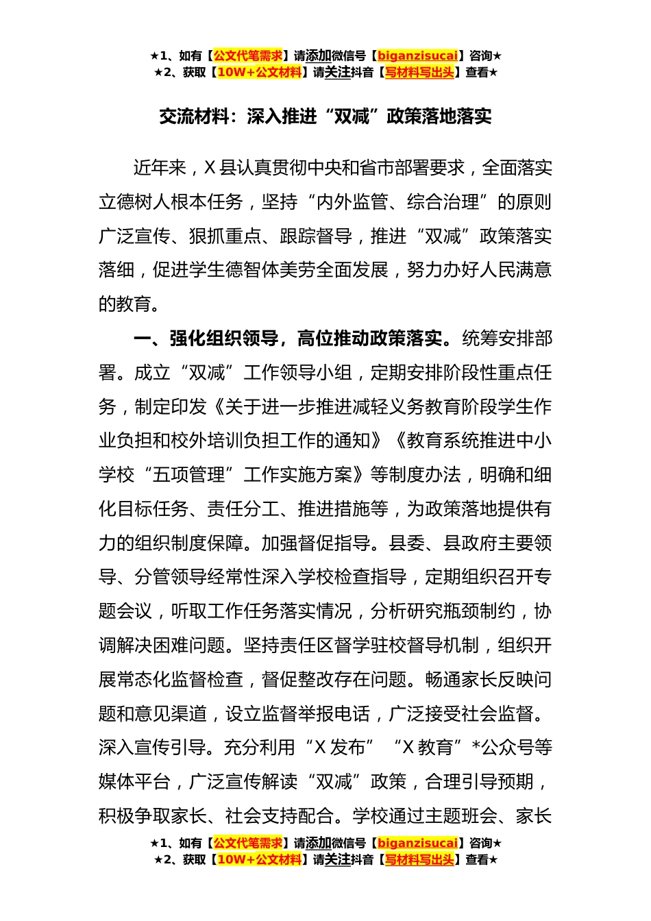★1、如有【公文代笔需求】请添加微信号【biganzisucai】咨询★★2、获取【10W+公文材料】请关注抖音【写材料写出头】查看★交流材料:深入推进“双减”政策落地落实近年来,X县认真贯彻中央和省市部署要求,全面落实立德树人根本任务,坚持“内外监管、综合治理”的原则广泛宣传、狠抓重点、跟踪督导,推进“双减”政策落实落细,促进学生德智体美劳全面发展,努力办好人民满意的教育。一、强化组织领导,高位推动政策落实。统筹安排部署。成立“双减”工作领导小组,定期安排阶段性重点任务,制定印发《关于进一步推进减轻义务教育阶段学生作业负担和校外培训负担工作的通知》《教育系统推进中小学校“五项管理”工作实施方案》等制度办法,明确和细化目标任务、责任分工、推进措施等,为政策落地提供有力的组织...