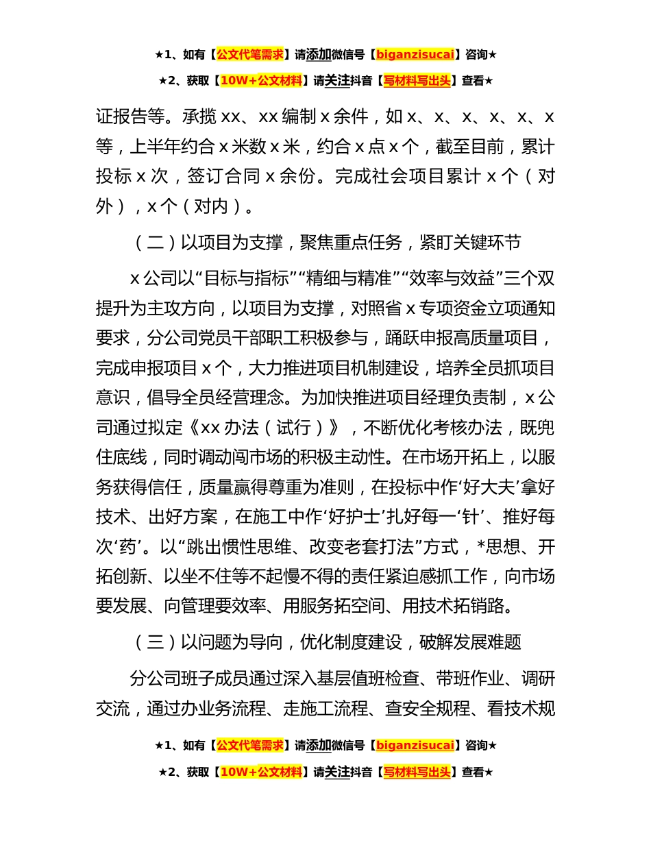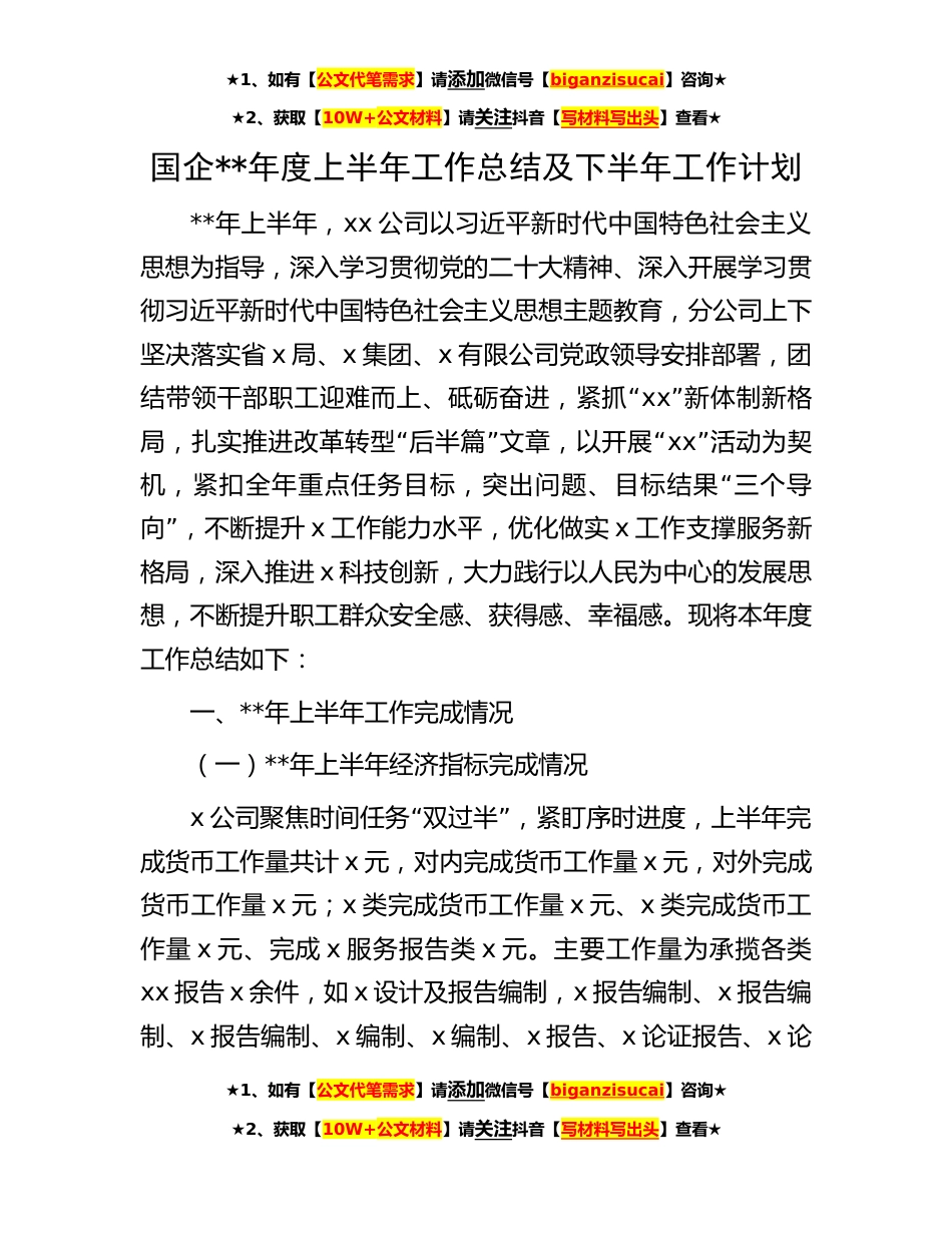★1、如有【公文代笔需求】请添加微信号【biganzisucai】咨询★★2、获取【10W+公文材料】请关注抖音【写材料写出头】查看★国企**年度上半年工作总结及下半年工作计划**年上半年,xx公司以习近平新时代中国特色社会主义思想为指导,深入学习贯彻党的二十大精神、深入开展学习贯彻习近平新时代中国特色社会主义思想主题教育,分公司上下坚决落实省x局、x集团、x有限公司党政领导安排部署,团“结带领干部职工迎难而上、砥砺奋进,紧抓xx”新体制新格“”“局,扎实推进改革转型后半篇文章,以开展xx”活动为契“机,紧扣全年重点任务目标,突出问题、目标结果三个导”向,不断提升x工作能力水平,优化做实x工作支撑服务新格局,深入推进x科技创新,大力践行以人民为中心的发展思想,不断提升职工群众安全感、获得...