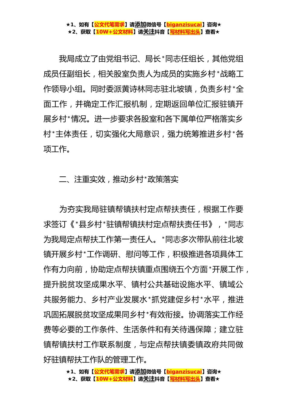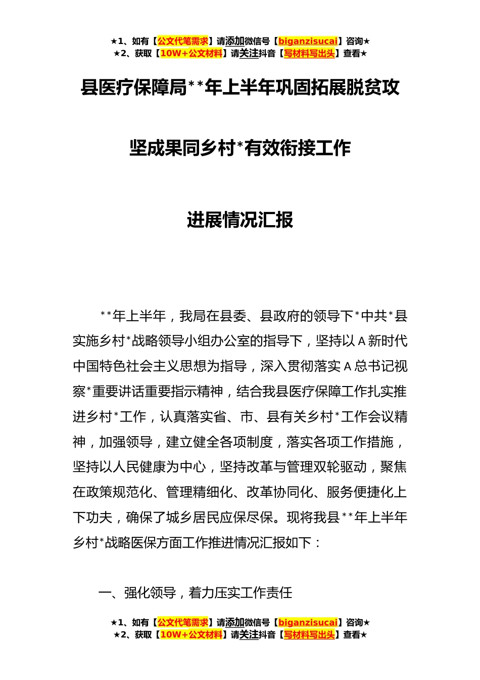 ★1、如有【公文代笔需求】请添加微信号【biganzisucai】咨询★★2、获取【10W+公文材料】请关注抖音【写材料写出头】查看★县医疗保障局**年上半年巩固拓展脱贫攻坚成果同乡村*有效衔接工作进展情况汇报**年上半年,我局在县委、县政府的领导下*中共*县实施乡村*战略领导小组办公室的指导下,坚持以A新时代中国特色社会主义思想为指导,深入贯彻落实A总书记视察*重要讲话重要指示精神,结合我县医疗保障工作扎实推进乡村*工作,认真落实省、市、县有关乡村*工作会议精神,加强领导,建立健全各项制度,落实各项工作措施,坚持以人民健康为中心,坚持改革与管理双轮驱动,聚焦在政策规范化、管理精细化、改革协同化、服务便捷化上下功夫,确保了城乡居民应保尽保。现将我县**年上半年乡村*战略医保方面工作推进情...