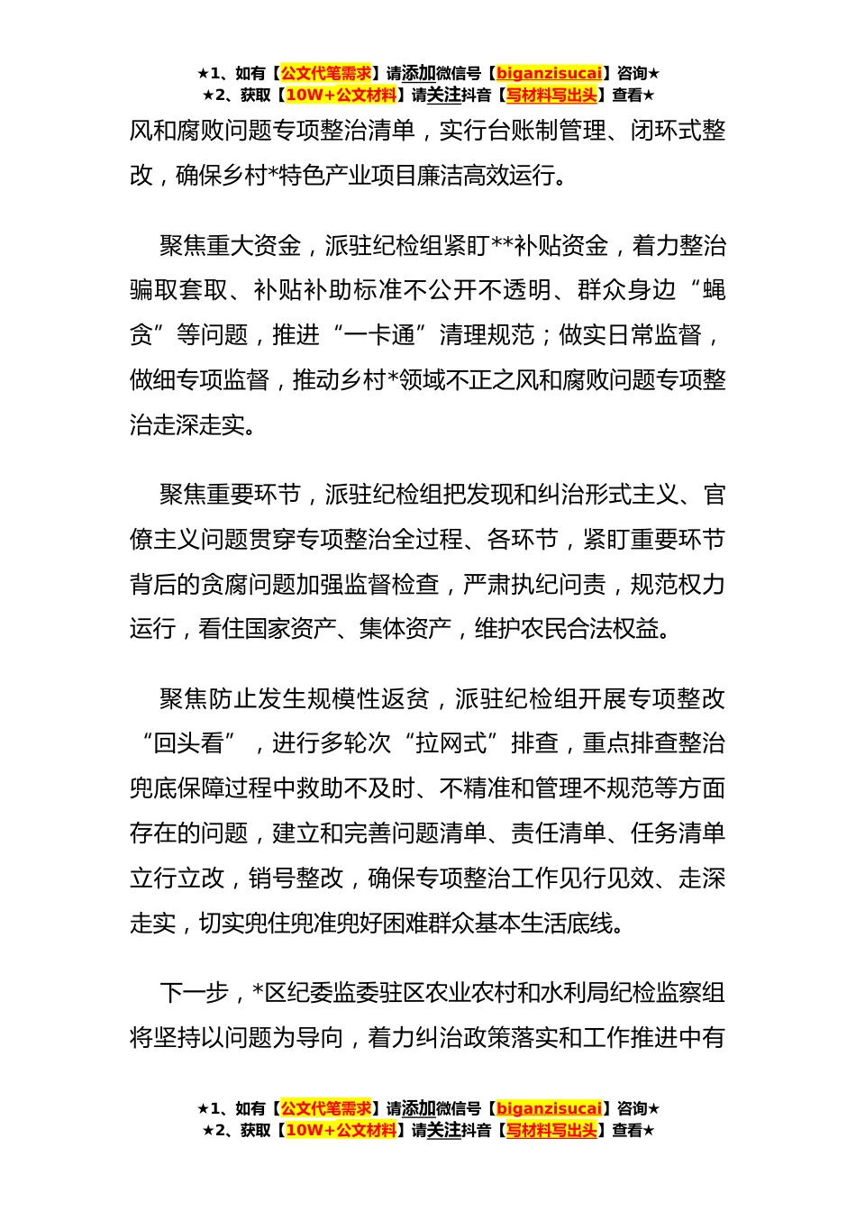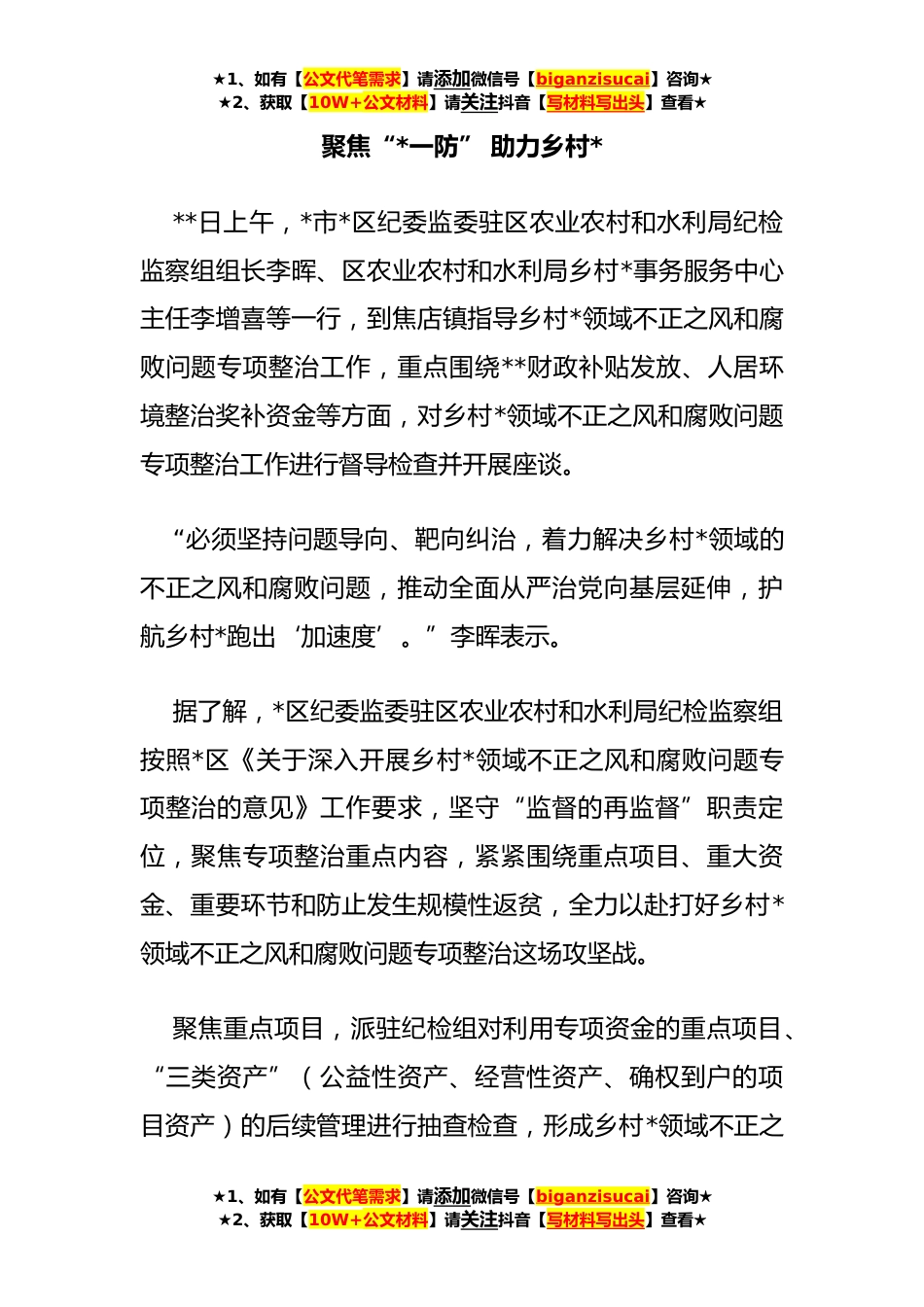 ★1、如有【公文代笔需求】请添加微信号【biganzisucai】咨询★★2、获取【10W+公文材料】请关注抖音【写材料写出头】查看★聚焦“*一防”助力乡村***日上午,*市*区纪委监委驻区农业农村和水利局纪检监察组组长李晖、区农业农村和水利局乡村*事务服务中心主任李增喜等一行,到焦店镇指导乡村*领域不正之风和腐败问题专项整治工作,重点围绕**财政补贴发放、人居环境整治奖补资金等方面,对乡村*领域不正之风和腐败问题专项整治工作进行督导检查并开展座谈。“必须坚持问题导向、靶向纠治,着力解决乡村*领域的不正之风和腐败问题,推动全面从严治党向基层延伸,护航乡村*跑出‘加速度’。”李晖表示。据了解,*区纪委监委驻区农业农村和水利局纪检监察组按照*区《关于深入开展乡村*领域不正之风和腐败问题专项整...