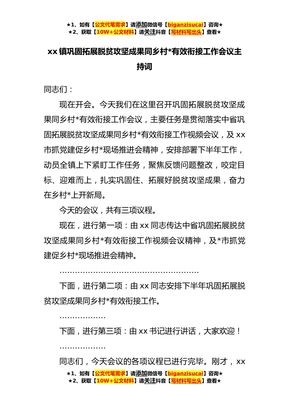 ★1、如有【公文代笔需求】请添加微信号【biganzisucai】咨询★★2、获取【10W+公文材料】请关注抖音【写材料写出头】查看★xx镇巩固拓展脱贫攻坚成果同乡村*有效衔接工作会议主持词同志们:现在开会。今天我们在这里召开巩固拓展脱贫攻坚成果同乡村*有效衔接工作会议,主要任务是贯彻落实中省巩固拓展脱贫攻坚成果同乡村*有效衔接工作视频会议,及xx市抓党建促乡村*现场推进会精神,安排部署下半年工作,动员全镇上下紧盯工作任务,聚焦反馈问题整改,咬定目标、迎难而上,扎实巩固住、拓展好脱贫攻坚成果,奋力在乡村*上开新局。今天的会议,共有三项议程。现在,进行第一项:由xx同志传达中省巩固拓展脱贫攻坚成果同乡村*有效衔接工作视频会议精神,及*市抓党建促乡村*现场推进会精神。……………………………...