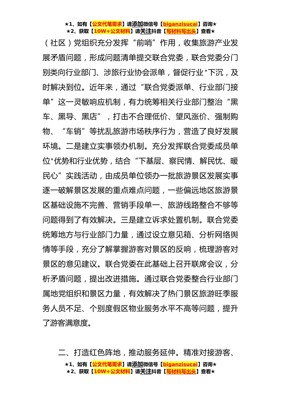 ★1、如有【公文代笔需求】请添加微信号【biganzisucai】咨询★★2、获取【10W+公文材料】请关注抖音【写材料写出头】查看★在*文化强州建设重点工作推进会上的汇报发言材料同志们:*州旅游*富集,是全国首批以市州创建国家全域旅游示范区单位,有*级景区*个、*级景区*个,年接待游客高峰期达到*万人次,正加快建设世界级旅游目的地。近年来,*州坚持“大旅游”理念,在重点景区探索打造“一个联合党委统筹、多个红色阵地支撑、多支服务队*障”的“红色矩阵”,全方位服务保障旅游产业健康发展,助力“两山”实践创新示范区建设。根据会议安排,现将有关工作进展情况汇报如下:一、成立联合党委,强化*统筹。借鉴社区“大党委”经验,组建由“重点旅游景区所在乡镇党委+涉旅行业部门党组织+景区党组织+行业协会党...