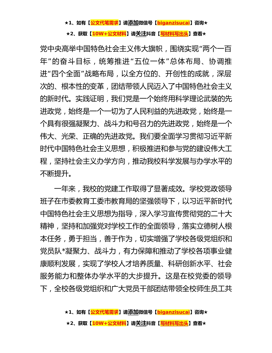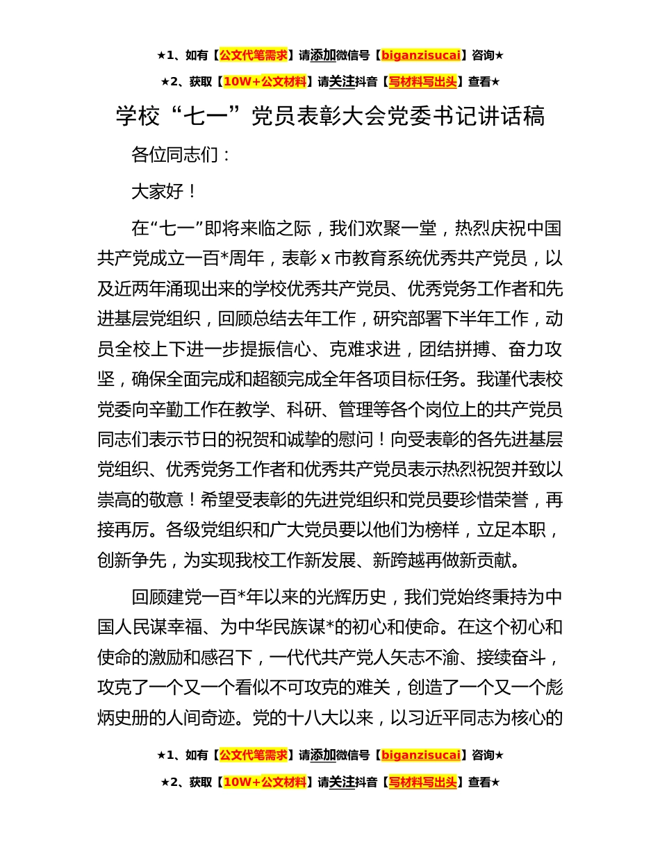 ★1、如有【公文代笔需求】请添加微信号【biganzisucai】咨询★★2、获取【10W+公文材料】请关注抖音【写材料写出头】查看★学校“七一”党员表彰大会党委书记讲话稿各位同志们:大家好!“”在七一即将来临之际,我们欢聚一堂,热烈庆祝中国共产党成立一百*周年,表彰x市教育系统优秀共产党员,以及近两年涌现出来的学校优秀共产党员、优秀党务工作者和先进基层党组织,回顾总结去年工作,研究部署下半年工作,动员全校上下进一步提振信心、克难求进,团结拼搏、奋力攻坚,确保全面完成和超额完成全年各项目标任务。我谨代表校党委向辛勤工作在教学、科研、管理等各个岗位上的共产党员同志们表示节日的祝贺和诚挚的慰问!向受表彰的各先进基层党组织、优秀党务工作者和优秀共产党员表示热烈祝贺并致以崇高的敬意...