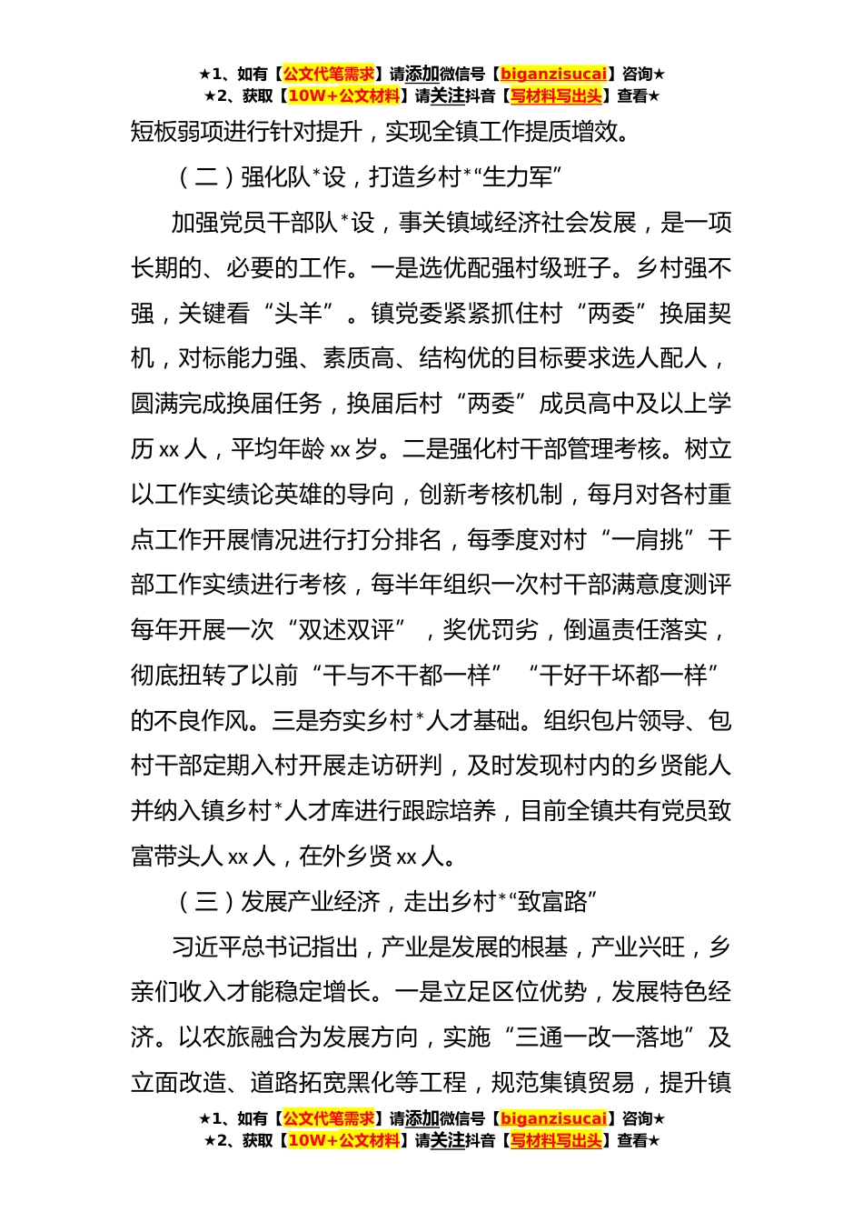 ★1、如有【公文代笔需求】请添加微信号【biganzisucai】咨询★★2、获取【10W+公文材料】请关注抖音【写材料写出头】查看★某镇在抓党建促乡村*发言(*)xx镇地处xx县东北部,辖xx个村xx个社区xx万人,是国家卫生乡镇、省文化旅游名镇、xx建设重点镇。近年来,镇党委始终坚持把党建引领作为推动乡村*的“第一抓手”,通过夯实基层组织、建强干部队伍、推动产业发展、提升治理效能,引领乡村*跑出“加速度”。(一)筑强先锋堡垒,点燃乡村*“红引擎”一是实施发展党员“**计划。各村每年至少培养*积极分子,争取发展*党员,不断优化党员结构,破解农村党员老龄化问题。二是创新党员教育管理方式。针对年轻党员在外务工多、学习教育参会率低的情况,我镇创新了“融入式”“双端式”“关爱式”党员分类教育管理办法...