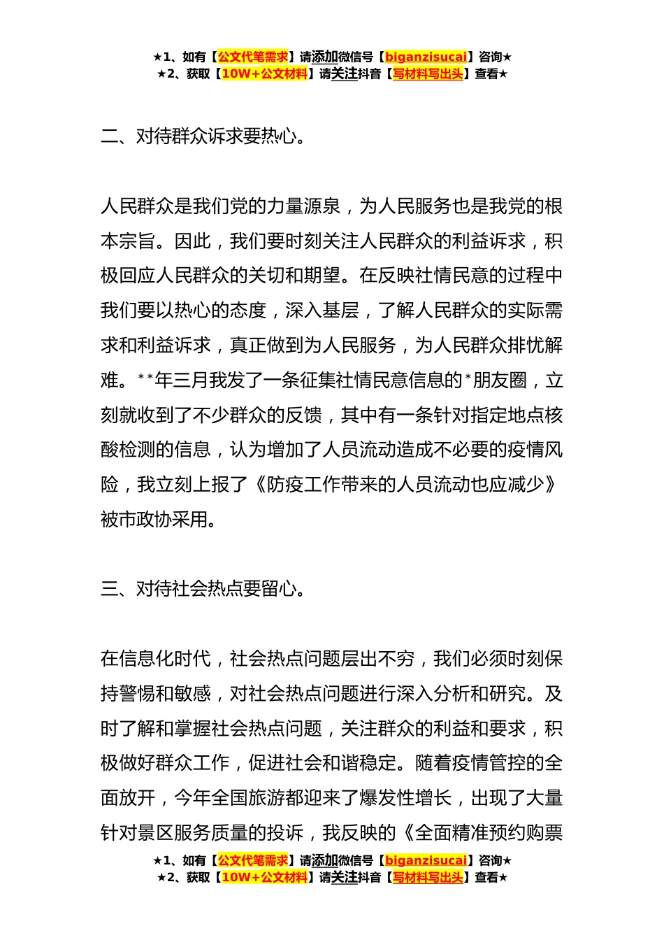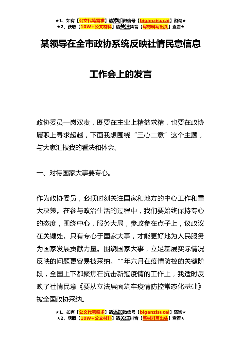 ★1、如有【公文代笔需求】请添加微信号【biganzisucai】咨询★★2、获取【10W+公文材料】请关注抖音【写材料写出头】查看★某领导在全市政协系统反映社情民意信息工作会上的发言政协委员一岗双责,既要在主业上精益求精,也要在政协履职上寻求超越,下面我想围绕“三心二意”这个主题,与大家汇报我的看法和体会。一、对待国家大事要专心。作为政协委员,必须时刻关注国家和地方的中心工作和重大决策。在参与政治生活的过程中,我们要始终保持专心的态度,围绕中心,服务大局,参政参在点子上,议政议在关键处。只有专心于国家大事,才能更好地为人民服务为国家发展贡献力量。围绕国家大事,立足基层实际情况反映的问题更容易被采纳。**年六月在疫情防控的关键阶段,全国上下都聚焦在抗击新冠疫情的工作上,我适...