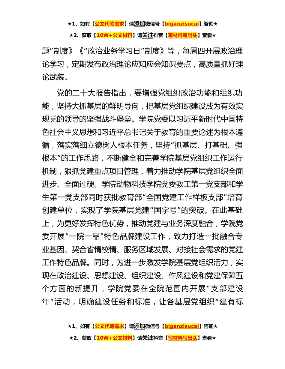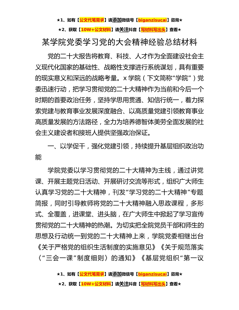 ★1、如有【公文代笔需求】请添加微信号【biganzisucai】咨询★★2、获取【10W+公文材料】请关注抖音【写材料写出头】查看★某学院党委学习党的大会精神经验总结材料党的二十大报告将教育、科技、人才作为全面建设社会主义现代化国家的基础性、战略性支撑进行系统谋划,具有重要的现实意义和深远的战略考量。x“”学院(下文简称学院)党委迅速行动,把学习贯彻党的二十大精神作为当前和今后一个时期的首要政治任务,坚持学思用贯通、知信行统一,着力探索党建与教育事业发展深度融合、以高质量党建引领教育事业高质量发展的方法路径,全力为培养德智体美劳全面发展的社会主义建设者和接班人提供坚强政治保证。一、以学促干,强化党建引领,持续提升基层组织政治功能学院党委以学习贯彻党的二十大精神为主线,通过...