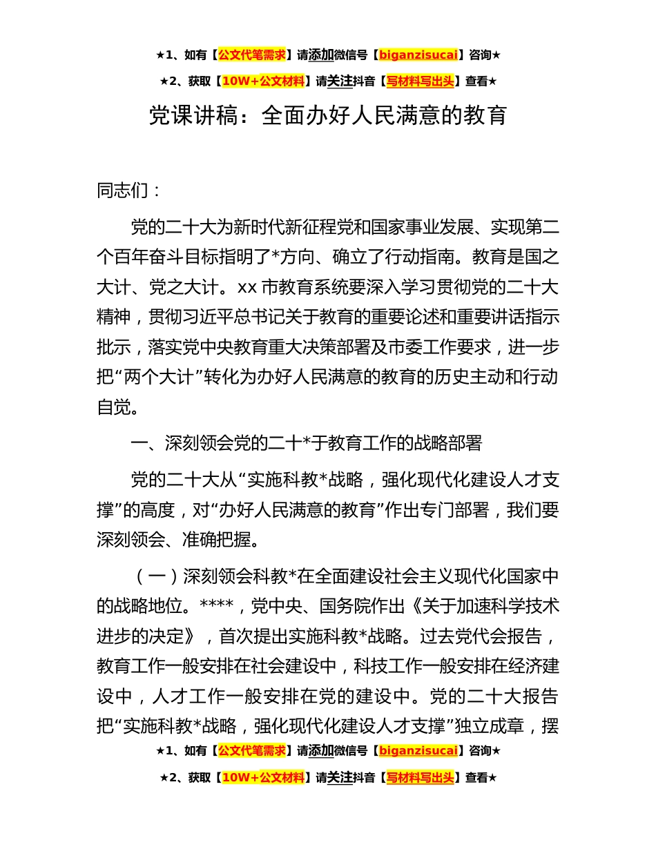 ★1、如有【公文代笔需求】请添加微信号【biganzisucai】咨询★★2、获取【10W+公文材料】请关注抖音【写材料写出头】查看★党课讲稿:全面办好人民满意的教育同志们:党的二十大为新时代新征程党和国家事业发展、实现第二个百年奋斗目标指明了*方向、确立了行动指南。教育是国之大计、党之大计。xx市教育系统要深入学习贯彻党的二十大精神,贯彻习近平总书记关于教育的重要论述和重要讲话指示批示,落实党中央教育重大决策部署及市委工作要求,进一步“”把两个大计转化为办好人民满意的教育的历史主动和行动自觉。一、深刻领会党的二十*于教育工作的战略部署“党的二十大从实施科教*战略,强化现代化建设人才支”“”撑的高度,对办好人民满意的教育作出专门部署,我们要深刻领会、准确把握。(一)深刻领会科教...