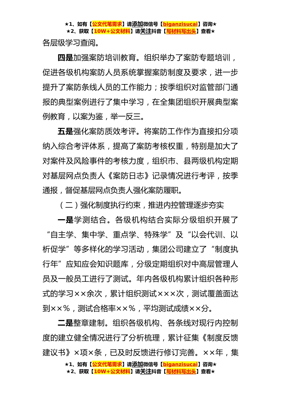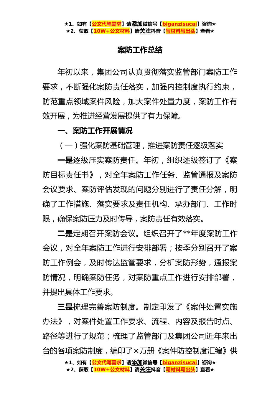 ★1、如有【公文代笔需求】请添加微信号【biganzisucai】咨询★★2、获取【10W+公文材料】请关注抖音【写材料写出头】查看★案防工作总结年初以来,集团公司认真贯彻落实监管部门案防工作要求,不断强化案防责任落实,加强内控制度执行约束,防范重点领域案件风险,加大案件处置力度,案防工作有效开展,为推进经营发展提供了有力保障。一、案防工作开展情况(一)强化案防基础管理,推进案防责任逐级落实一是逐级压实案防责任。年初,组织逐级签订了《案防目标责任书》,对全年案防工作任务、监管通报及案防会议要求、案防评估发现的问题分别进行了责任分解,明确了工作措施、落实要求及责任机构、承办部门、工作时限,确保案防压力及时传导,案防责任有效落实。二是定期召开案防会议。组织召开了**年度案防工作...