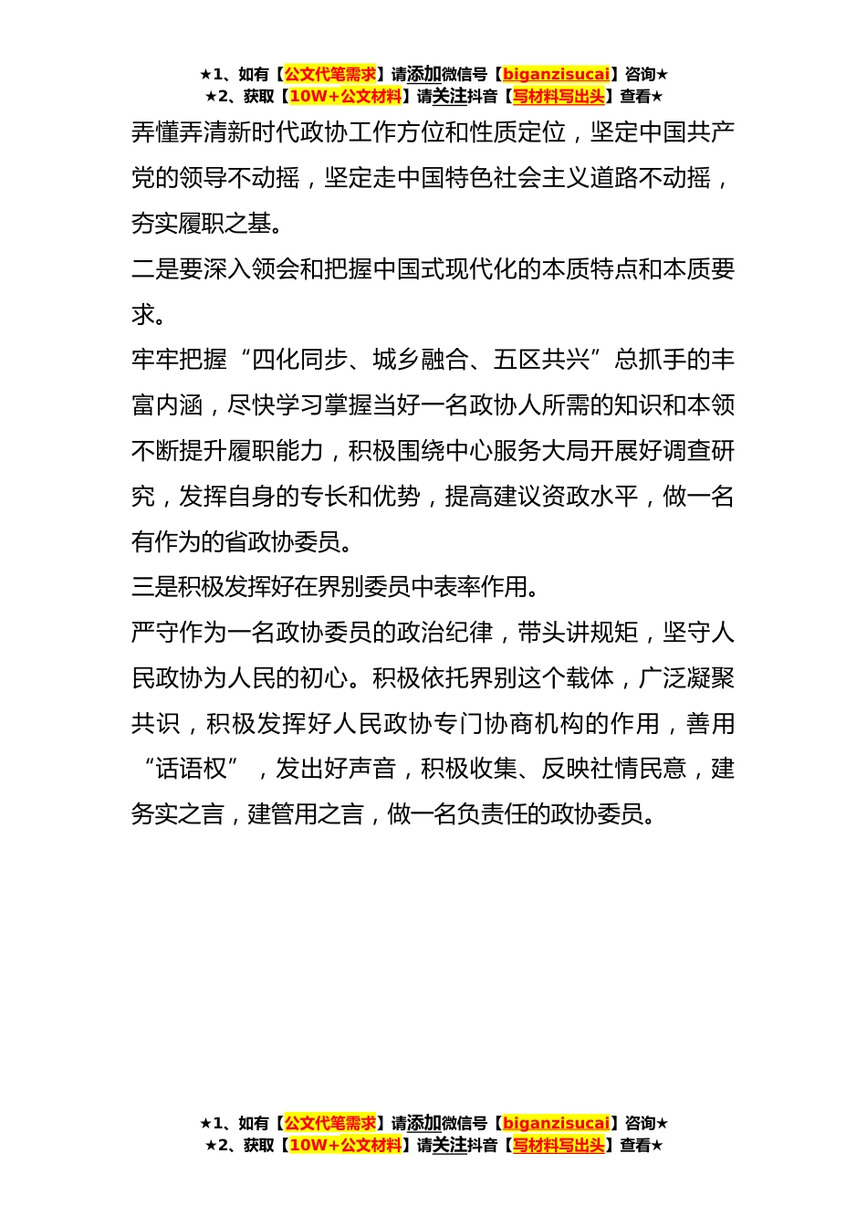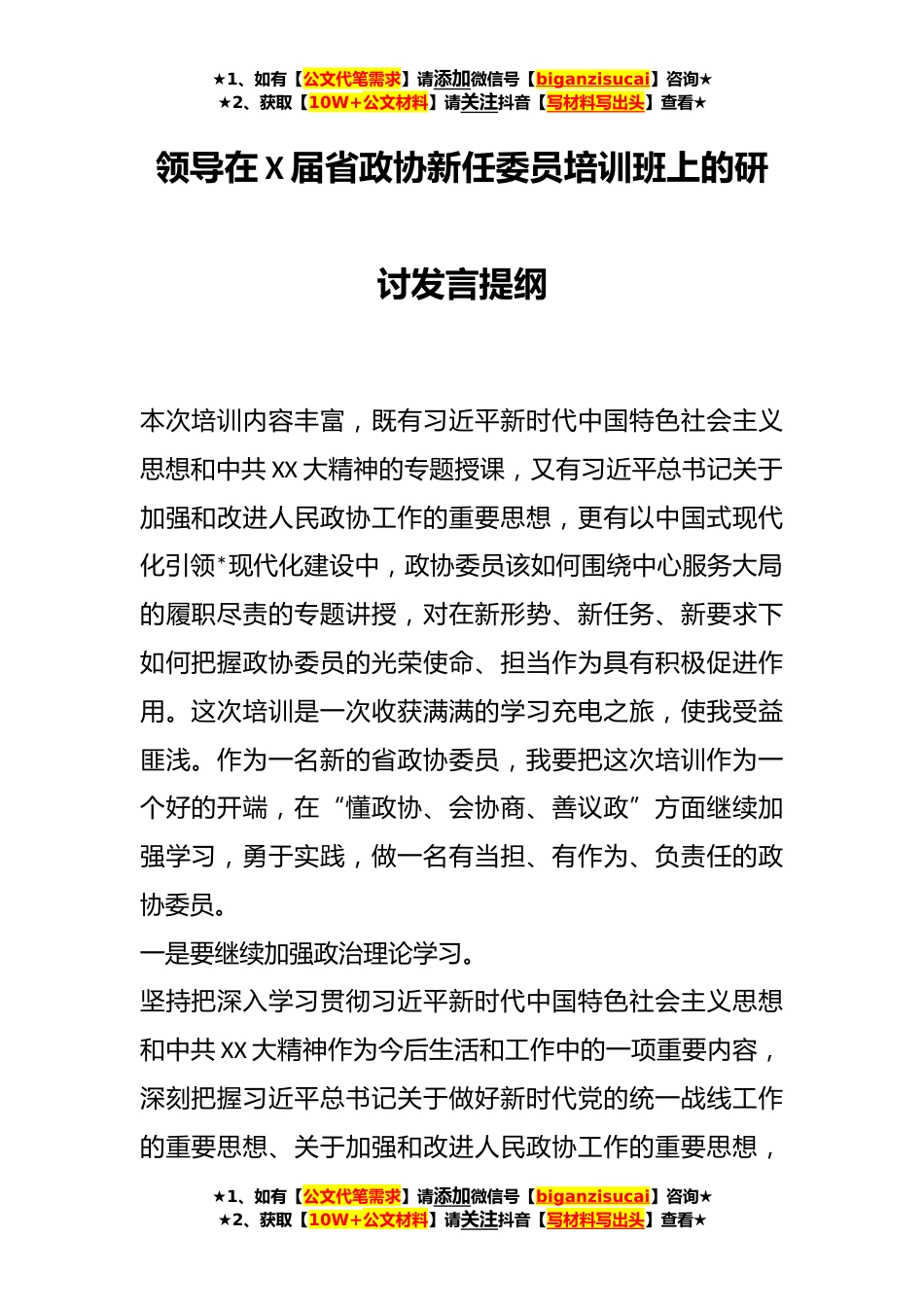★1、如有【公文代笔需求】请添加微信号【biganzisucai】咨询★★2、获取【10W+公文材料】请关注抖音【写材料写出头】查看★领导在X届省政协新任委员培训班上的研讨发言提纲本次培训内容丰富,既有习近平新时代中国特色社会主义思想和中共XX大精神的专题授课,又有习近平总书记关于加强和改进人民政协工作的重要思想,更有以中国式现代化引领*现代化建设中,政协委员该如何围绕中心服务大局的履职尽责的专题讲授,对在新形势、新任务、新要求下如何把握政协委员的光荣使命、担当作为具有积极促进作用。这次培训是一次收获满满的学习充电之旅,使我受益匪浅。作为一名新的省政协委员,我要把这次培训作为一个好的开端,在“懂政协、会协商、善议政”方面继续加强学习,勇于实践,做一名有当担、有作为、负责任的政...