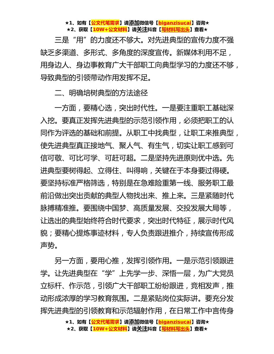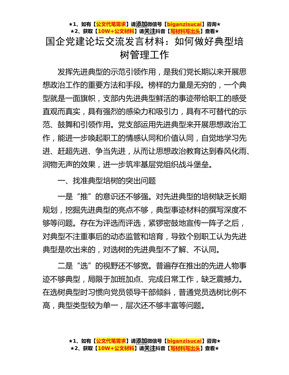 ★1、如有【公文代笔需求】请添加微信号【biganzisucai】咨询★★2、获取【10W+公文材料】请关注抖音【写材料写出头】查看★国企党建论坛交流发言材料:如何做好典型培树管理工作发挥先进典型的示范引领作用,是我们党长期以来开展思想政治工作的重要方法和手段。榜样的力量是无穷的,一个典型就是一面旗帜,支部内先进典型鲜活的事迹带给职工的感受直观而真实,具有强烈的感染力和吸引力,具有不可替代的示范、鼓舞和引领作用。党支部运用先进典型来开展思想政治工作,能进一步唤起职工的情感认同和价值认同,自觉地学习先进、赶超先进、争当先进,从而让思想政治教育达到春风化雨、润物无声的效果,进一步筑牢基层党组织战斗堡垒。一、找准典型培树的突出问题一是“推”的意识还不够强。对先进典型的培树缺乏长...