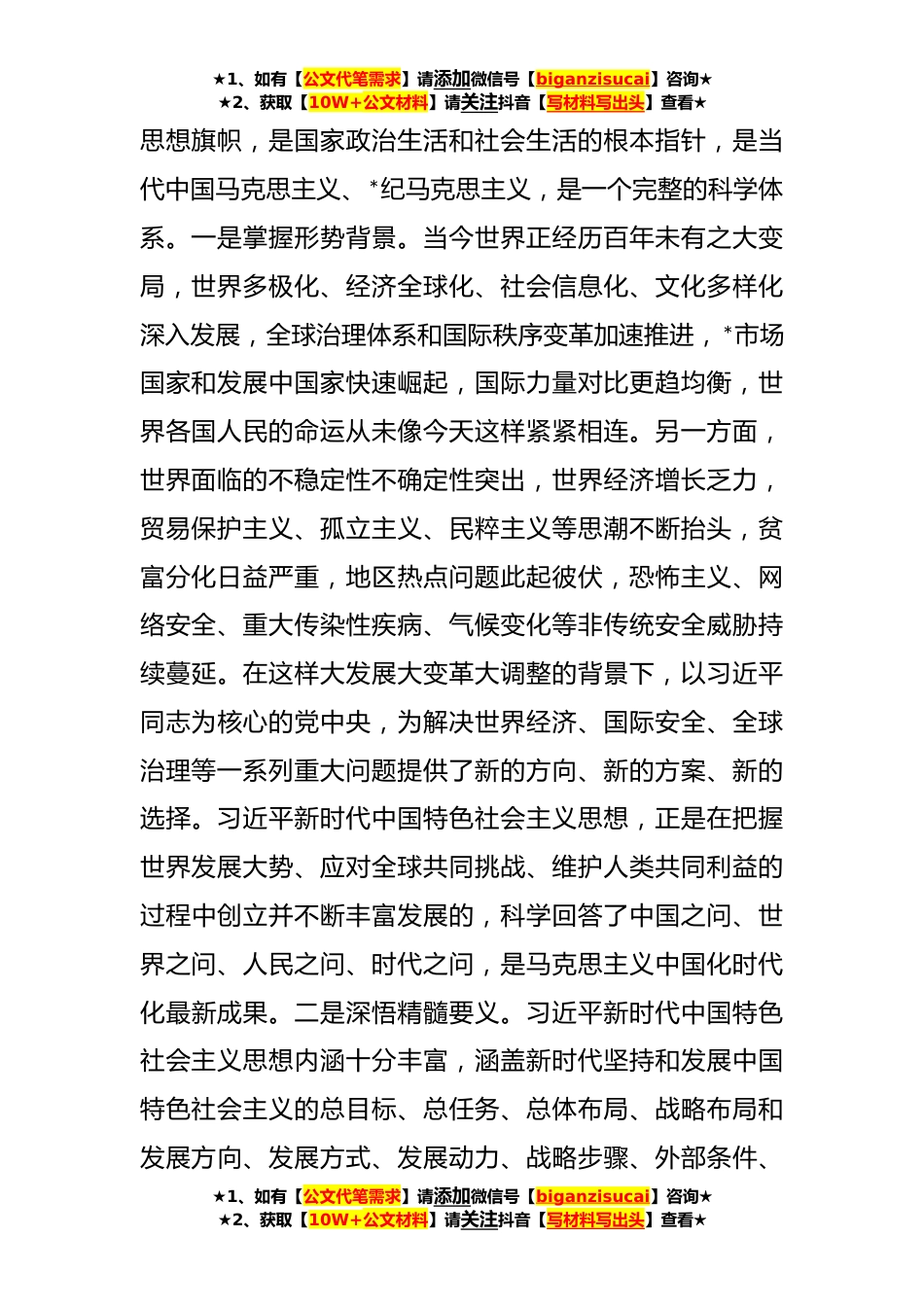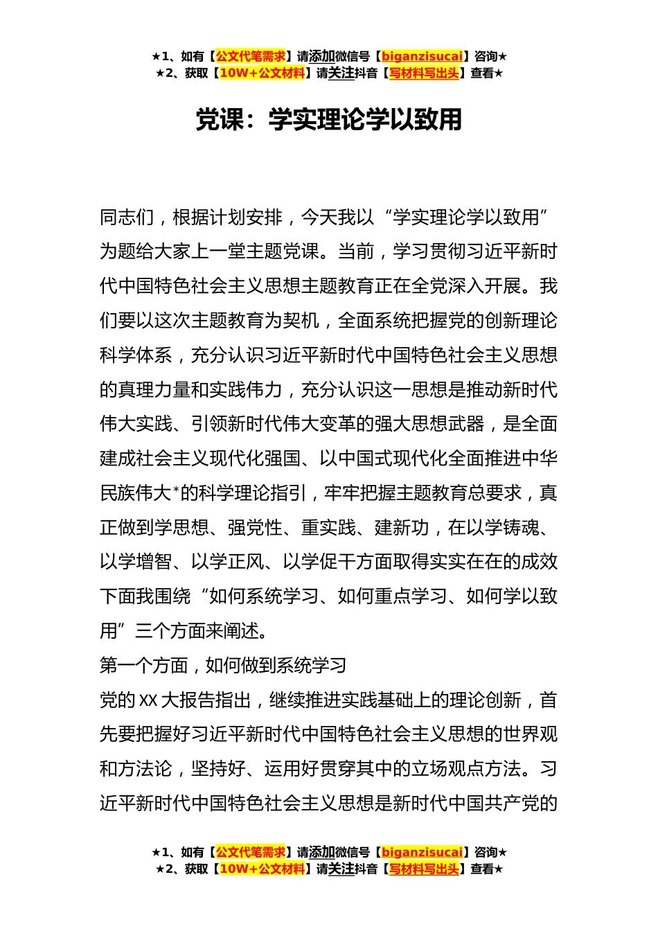 ★1、如有【公文代笔需求】请添加微信号【biganzisucai】咨询★★2、获取【10W+公文材料】请关注抖音【写材料写出头】查看★党课:学实理论学以致用同志们,根据计划安排,今天我以“学实理论学以致用”为题给大家上一堂主题党课。当前,学习贯彻习近平新时代中国特色社会主义思想主题教育正在全党深入开展。我们要以这次主题教育为契机,全面系统把握党的创新理论科学体系,充分认识习近平新时代中国特色社会主义思想的真理力量和实践伟力,充分认识这一思想是推动新时代伟大实践、引领新时代伟大变革的强大思想武器,是全面建成社会主义现代化强国、以中国式现代化全面推进中华民族伟大*的科学理论指引,牢牢把握主题教育总要求,真正做到学思想、强党性、重实践、建新功,在以学铸魂、以学增智、以学正风、以学...