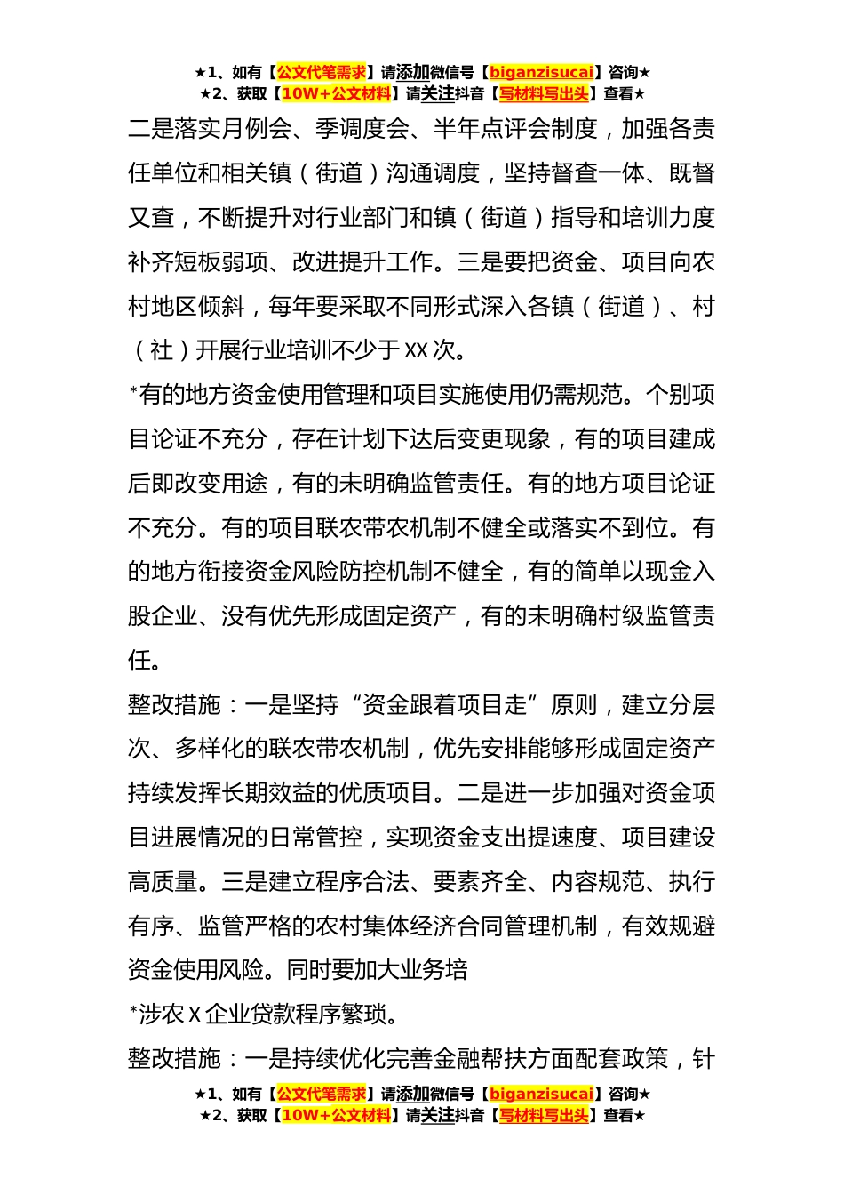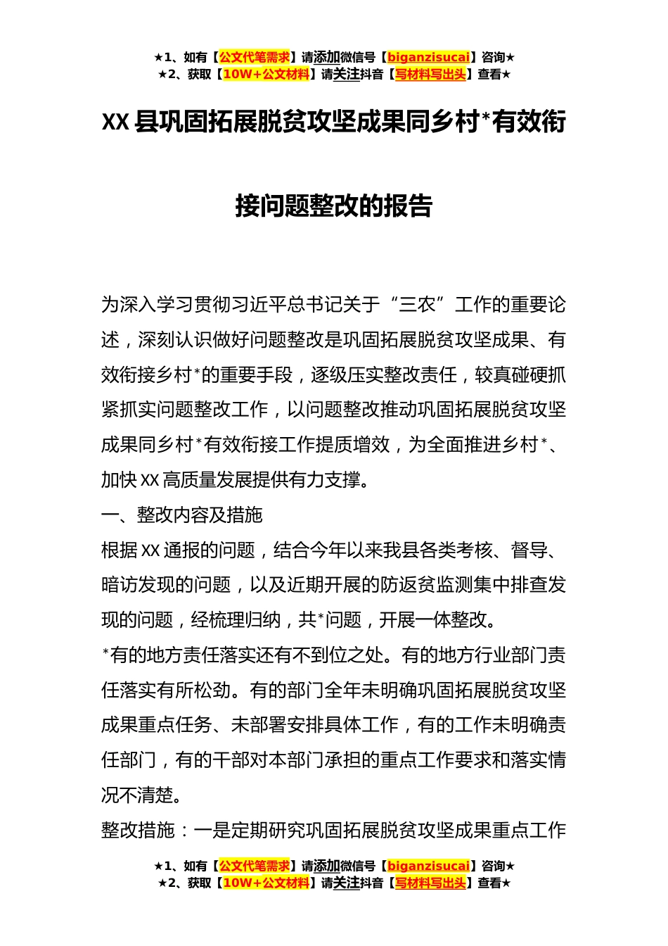 ★1、如有【公文代笔需求】请添加微信号【biganzisucai】咨询★★2、获取【10W+公文材料】请关注抖音【写材料写出头】查看★XX县巩固拓展脱贫攻坚成果同乡村*有效衔接问题整改的报告为深入学习贯彻习近平总书记关于“三农”工作的重要论述,深刻认识做好问题整改是巩固拓展脱贫攻坚成果、有效衔接乡村*的重要手段,逐级压实整改责任,较真碰硬抓紧抓实问题整改工作,以问题整改推动巩固拓展脱贫攻坚成果同乡村*有效衔接工作提质增效,为全面推进乡村*、加快XX高质量发展提供有力支撑。一、整改内容及措施根据XX通报的问题,结合今年以来我县各类考核、督导、暗访发现的问题,以及近期开展的防返贫监测集中排查发现的问题,经梳理归纳,共*问题,开展一体整改。*有的地方责任落实还有不到位之处。有的地方行业部门...