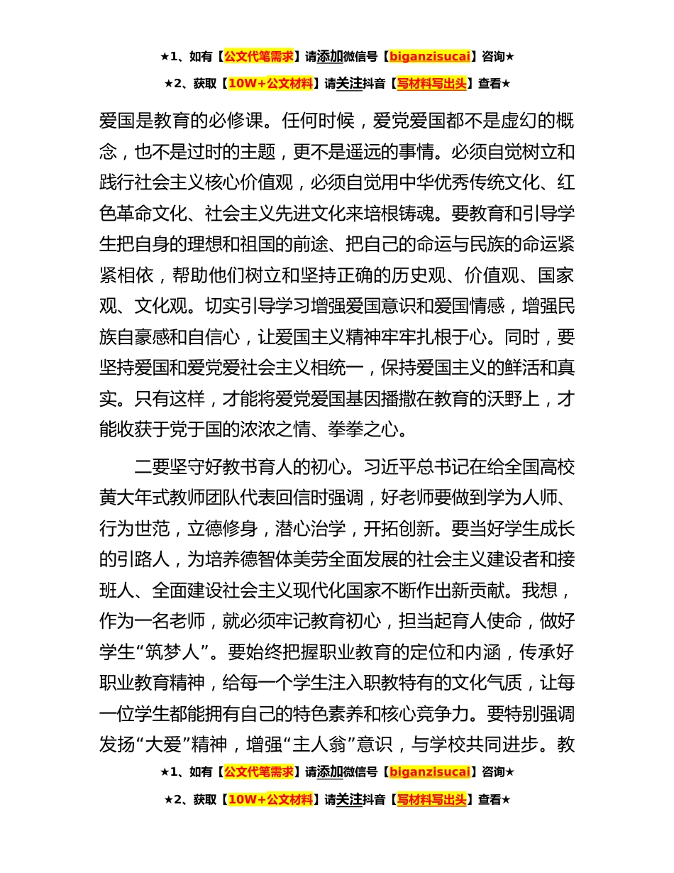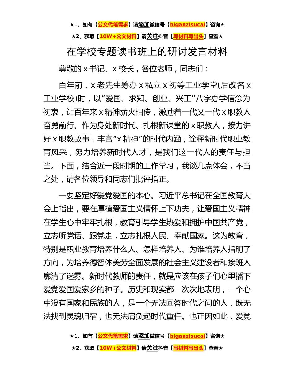 ★1、如有【公文代笔需求】请添加微信号【biganzisucai】咨询★★2、获取【10W+公文材料】请关注抖音【写材料写出头】查看★在学校专题读书班上的研讨发言材料尊敬的x书记、x校长,各位老师,同志们:百年前,x老先生筹办x私立x初等工业学堂(后改名x工业学校)“”时,以爱国、求知、创业、兴工八字办学信念为初衷,让百年来x精神薪火相传,激励着一代又一代x职教人奋勇前行。作为身处新时代、扎根新课堂的x职教人,接力讲好x“职教故事,丰富x”精神的时代内涵,诠释新时代职业教育风采,努力培养新时代人才,是我们这一代人的责任与担当。下面,结合近一段时期的工作学习,我谈几点体会,不当之处,请各位领导和同志们批评指正。一要坚定好爱党爱国的本心。习近平总书记在全国教育大会上指出,要在厚植爱国主义情...
