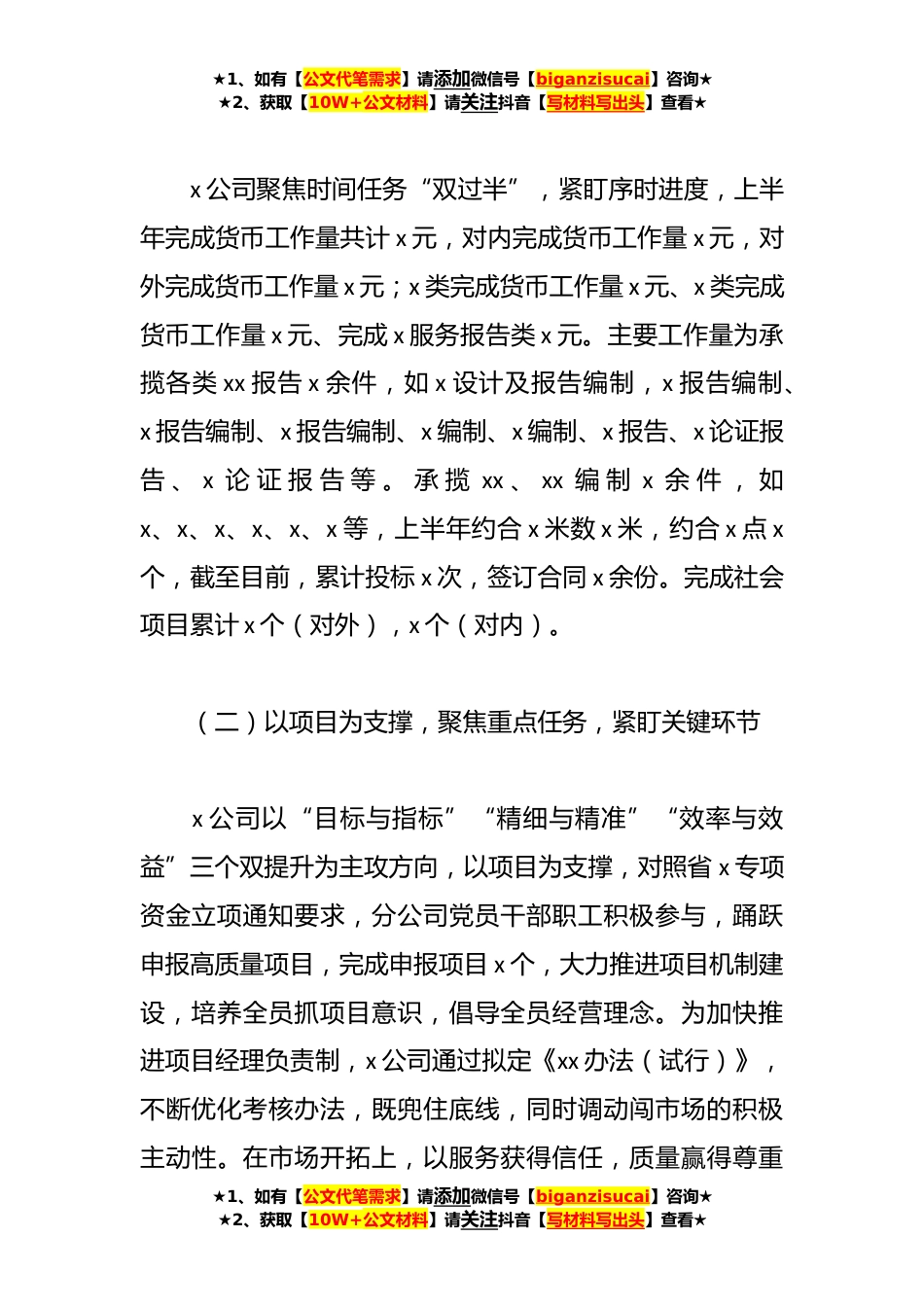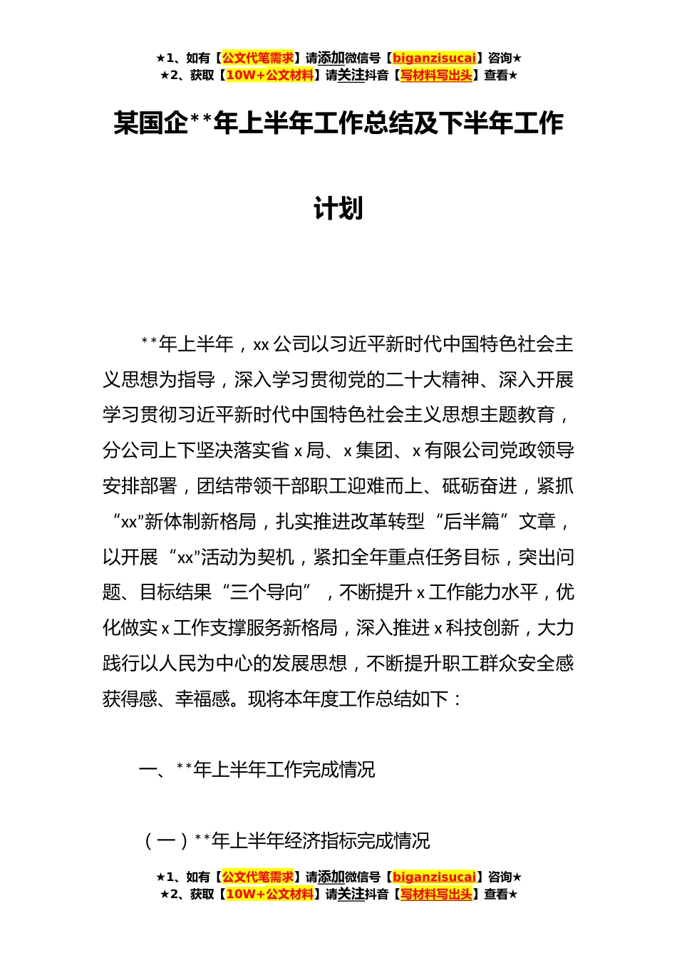 ★1、如有【公文代笔需求】请添加微信号【biganzisucai】咨询★★2、获取【10W+公文材料】请关注抖音【写材料写出头】查看★某国企**年上半年工作总结及下半年工作计划**年上半年,xx公司以习近平新时代中国特色社会主义思想为指导,深入学习贯彻党的二十大精神、深入开展学习贯彻习近平新时代中国特色社会主义思想主题教育,分公司上下坚决落实省x局、x集团、x有限公司党政领导安排部署,团结带领干部职工迎难而上、砥砺奋进,紧抓“xx”新体制新格局,扎实推进改革转型“后半篇”文章,以开展“xx”活动为契机,紧扣全年重点任务目标,突出问题、目标结果“三个导向”,不断提升x工作能力水平,优化做实x工作支撑服务新格局,深入推进x科技创新,大力践行以人民为中心的发展思想,不断提升职工群众安全感获得感...