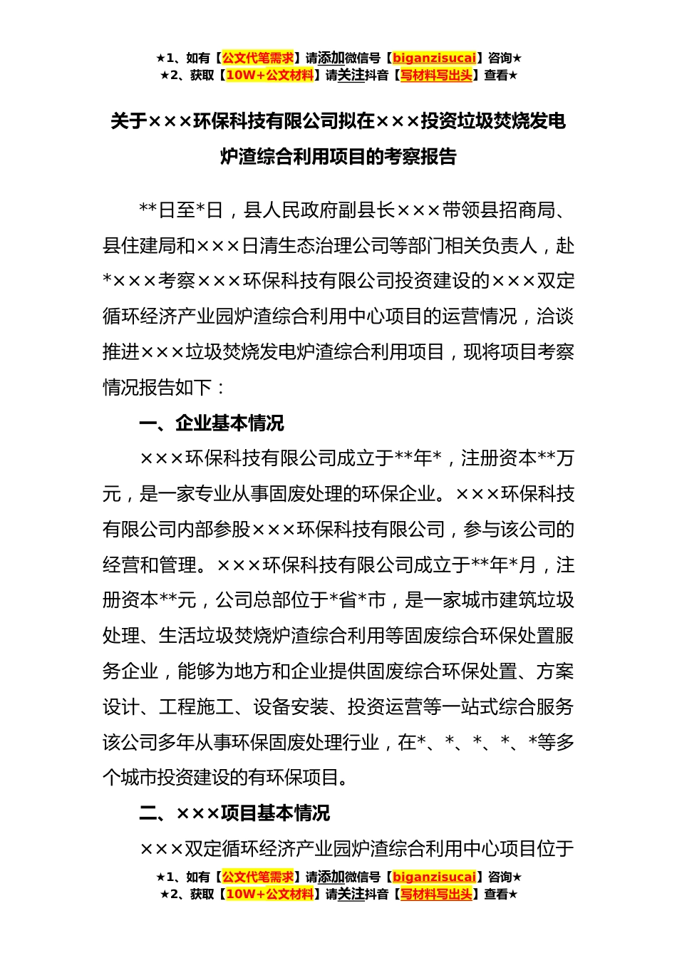★1、如有【公文代笔需求】请添加微信号【biganzisucai】咨询★★2、获取【10W+公文材料】请关注抖音【写材料写出头】查看★关于×××环保科技有限公司拟在×××投资垃圾焚烧发电炉渣综合利用项目的考察报告**日至*日,县人民政府副县长×××带领县招商局、县住建局和×××日清生态治理公司等部门相关负责人,赴*×××考察×××环保科技有限公司投资建设的×××双定循环经济产业园炉渣综合利用中心项目的运营情况,洽谈推进×××垃圾焚烧发电炉渣综合利用项目,现将项目考察情况报告如下:一、企业基本情况×××环保科技有限公司成立于**年*,注册资本**万元,是一家专业从事固废处理的环保企业。×××环保科技有限公司内部参股×××环保科技有限公司,参与该公司的经营和管理。×××环保科技有限公司...