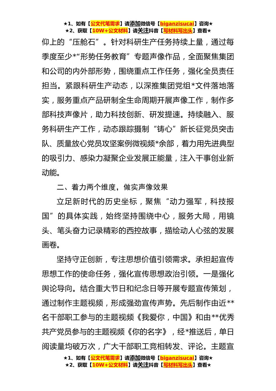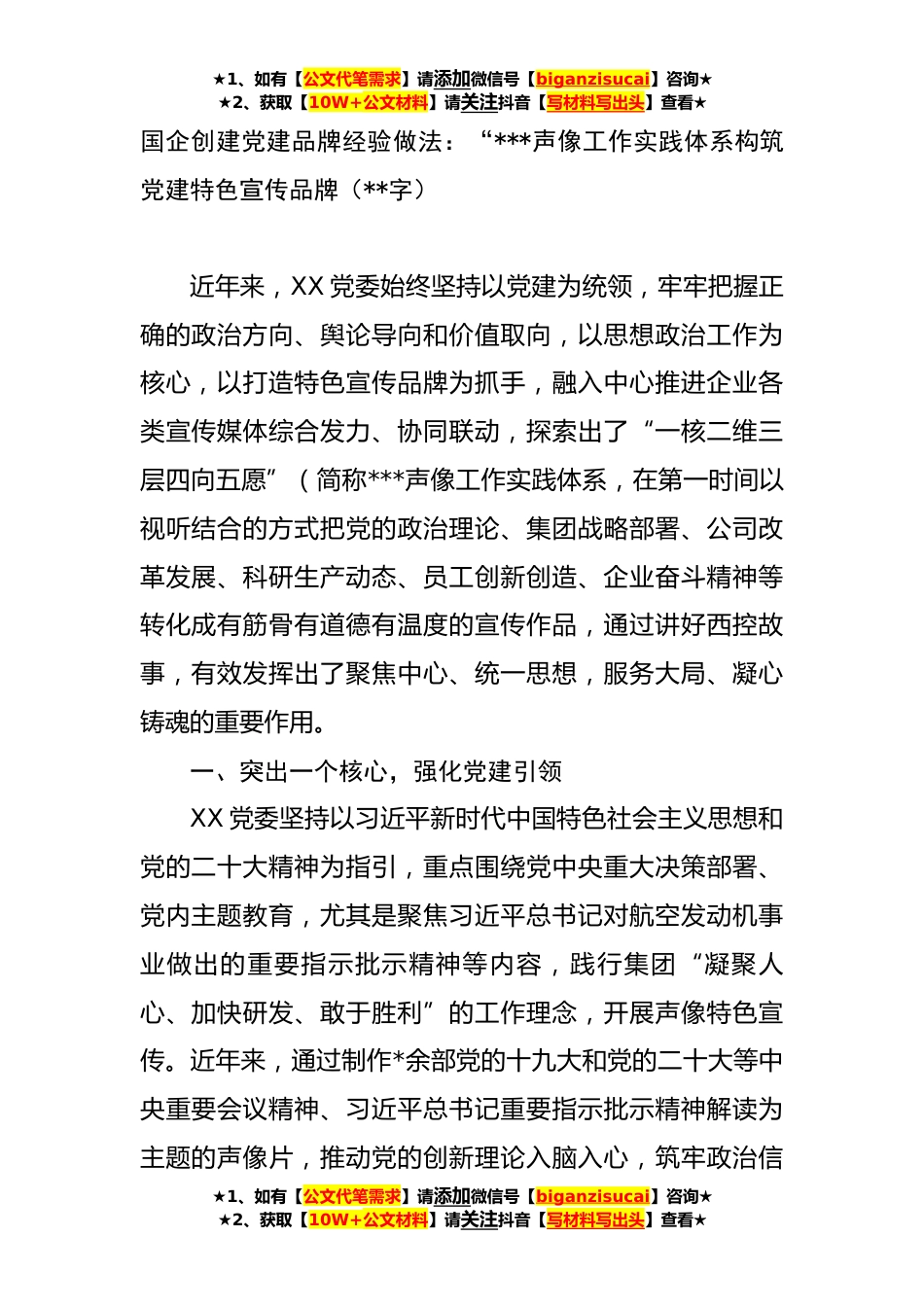 ★1、如有【公文代笔需求】请添加微信号【biganzisucai】咨询★★2、获取【10W+公文材料】请关注抖音【写材料写出头】查看★国企创建党建品牌经验做法:“***声像工作实践体系构筑党建特色宣传品牌(**字)近年来,XX党委始终坚持以党建为统领,牢牢把握正确的政治方向、舆论导向和价值取向,以思想政治工作为核心,以打造特色宣传品牌为抓手,融入中心推进企业各类宣传媒体综合发力、协同联动,探索出了“一核二维三层四向五愿”(简称***声像工作实践体系,在第一时间以视听结合的方式把党的政治理论、集团战略部署、公司改革发展、科研生产动态、员工创新创造、企业奋斗精神等转化成有筋骨有道德有温度的宣传作品,通过讲好西控故事,有效发挥出了聚焦中心、统一思想,服务大局、凝心铸魂的重要作用。一、突出...