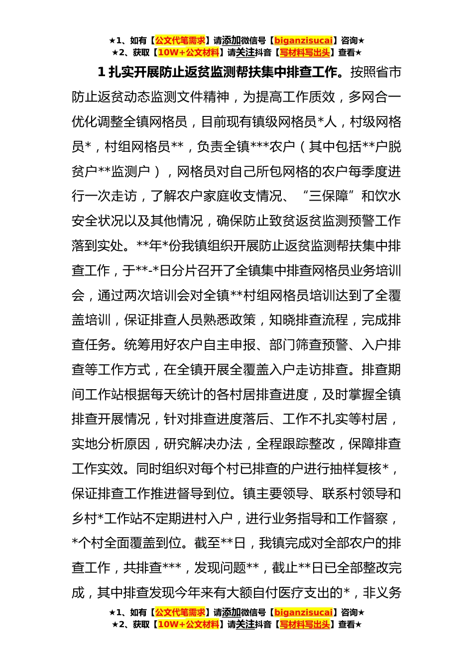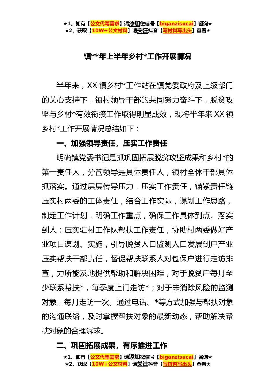 ★1、如有【公文代笔需求】请添加微信号【biganzisucai】咨询★★2、获取【10W+公文材料】请关注抖音【写材料写出头】查看★镇**年上半年乡村*工作开展情况半年来,XX镇乡村*工作站在镇党委政府及上级部门的关心支持下,镇村领导干部的共同努力奋斗下,脱贫攻坚与乡村*有效衔接工作取得明显成效,现将半年来XX镇乡村*工作开展情况总结如下:一、加强领导责任,压实工作责任明确镇党委书记是抓巩固拓展脱贫攻坚成果和乡村*的第一责任人,分管领导是具体责任人,镇村全体干部具体抓落实。通过层层传导压力,压实工作责任,锚紧责任链压实村两委的主体责任,结合工作实际,谋划工作思路,制定工作计划,明确工作重点,确保工作具体到点、落实到人;压实驻村工作队帮扶工作责任,协助村两委做好产业项目谋划、实施,引...
