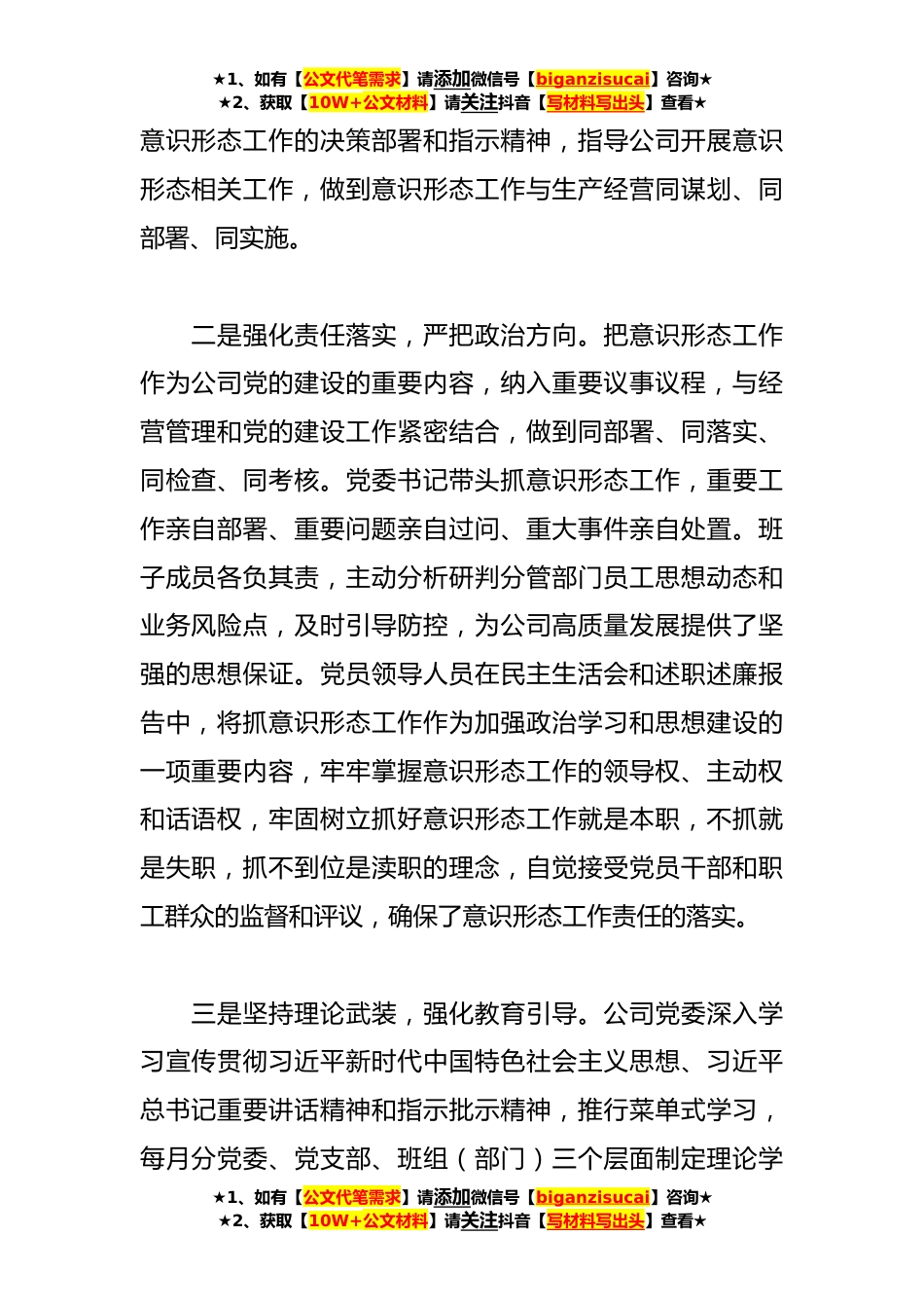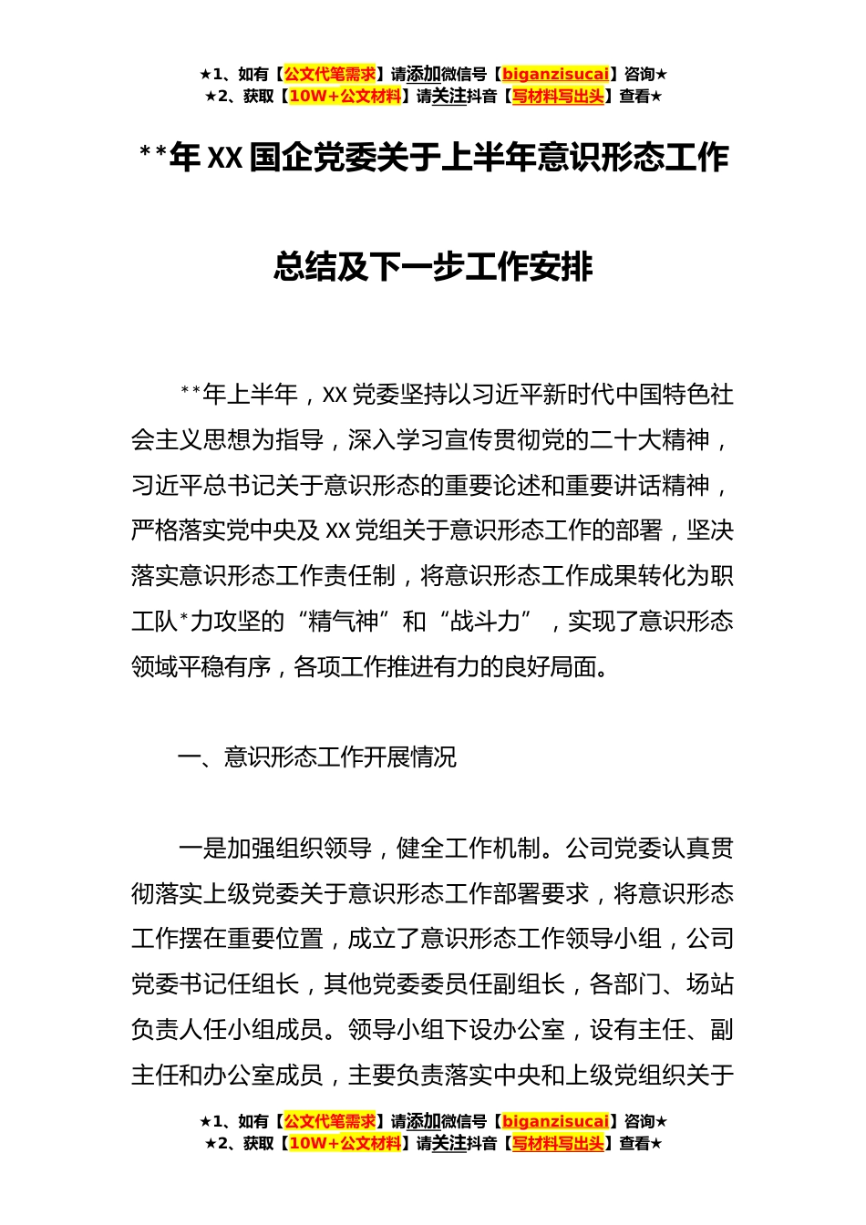 ★1、如有【公文代笔需求】请添加微信号【biganzisucai】咨询★★2、获取【10W+公文材料】请关注抖音【写材料写出头】查看★**年XX国企党委关于上半年意识形态工作总结及下一步工作安排**年上半年,XX党委坚持以习近平新时代中国特色社会主义思想为指导,深入学习宣传贯彻党的二十大精神,习近平总书记关于意识形态的重要论述和重要讲话精神,严格落实党中央及XX党组关于意识形态工作的部署,坚决落实意识形态工作责任制,将意识形态工作成果转化为职工队*力攻坚的“精气神”和“战斗力”,实现了意识形态领域平稳有序,各项工作推进有力的良好局面。一、意识形态工作开展情况一是加强组织领导,健全工作机制。公司党委认真贯彻落实上级党委关于意识形态工作部署要求,将意识形态工作摆在重要位置,成立了意识形态...