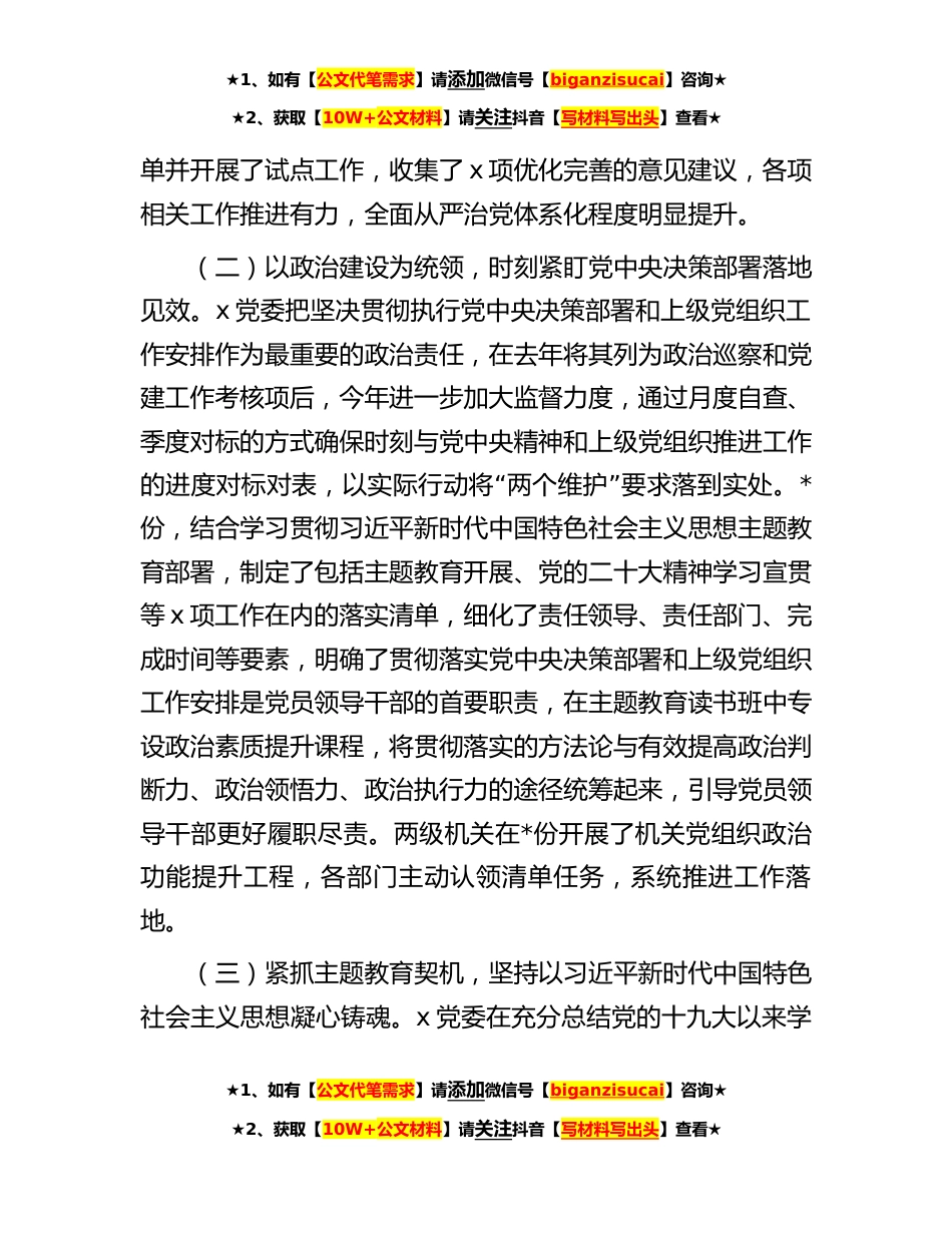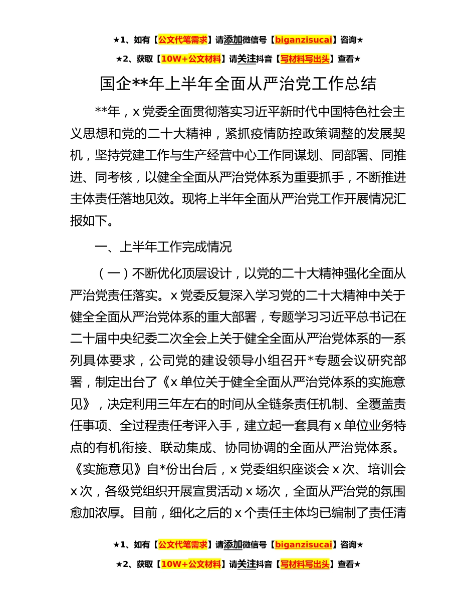 ★1、如有【公文代笔需求】请添加微信号【biganzisucai】咨询★★2、获取【10W+公文材料】请关注抖音【写材料写出头】查看★国企**年上半年全面从严治党工作总结**年,x党委全面贯彻落实习近平新时代中国特色社会主义思想和党的二十大精神,紧抓疫情防控政策调整的发展契机,坚持党建工作与生产经营中心工作同谋划、同部署、同推进、同考核,以健全全面从严治党体系为重要抓手,不断推进主体责任落地见效。现将上半年全面从严治党工作开展情况汇报如下。一、上半年工作完成情况(一)不断优化顶层设计,以党的二十大精神强化全面从严治党责任落实。x党委反复深入学习党的二十大精神中关于健全全面从严治党体系的重大部署,专题学习习近平总书记在二十届中央纪委二次全会上关于健全全面从严治党体系的一系列具体要...