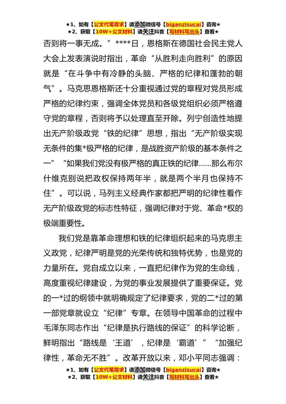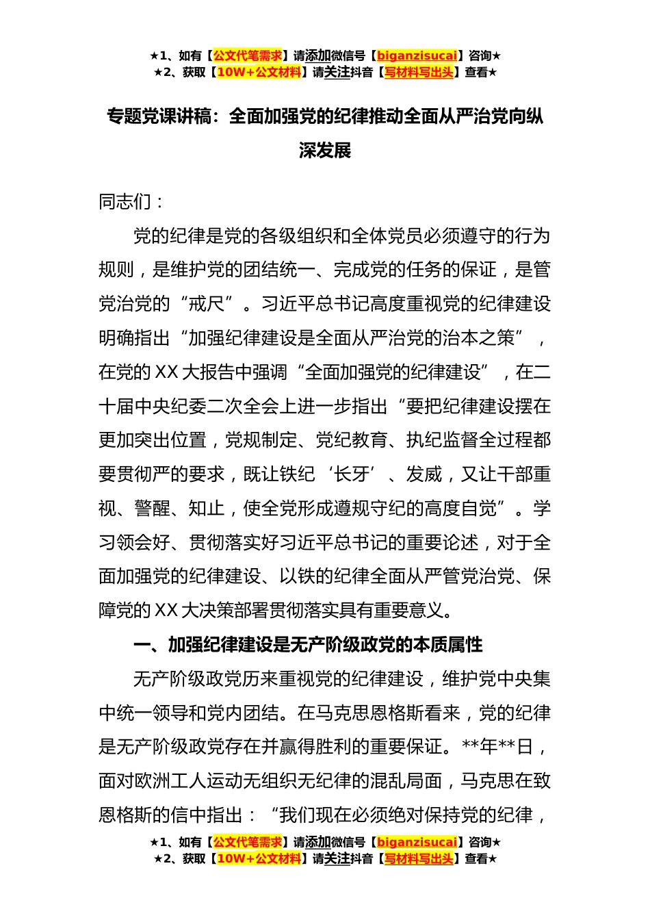 ★1、如有【公文代笔需求】请添加微信号【biganzisucai】咨询★★2、获取【10W+公文材料】请关注抖音【写材料写出头】查看★专题党课讲稿:全面加强党的纪律推动全面从严治党向纵深发展同志们:党的纪律是党的各级组织和全体党员必须遵守的行为规则,是维护党的团结统一、完成党的任务的保证,是管党治党的“戒尺”。习近平总书记高度重视党的纪律建设明确指出“加强纪律建设是全面从严治党的治本之策”,在党的XX大报告中强调“全面加强党的纪律建设”,在二十届中央纪委二次全会上进一步指出“要把纪律建设摆在更加突出位置,党规制定、党纪教育、执纪监督全过程都要贯彻严的要求,既让铁纪‘长牙’、发威,又让干部重视、警醒、知止,使全党形成遵规守纪的高度自觉”。学习领会好、贯彻落实好习近平总书记的重...