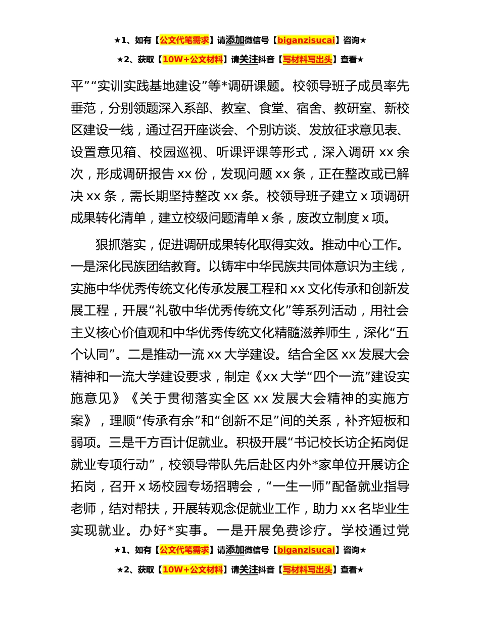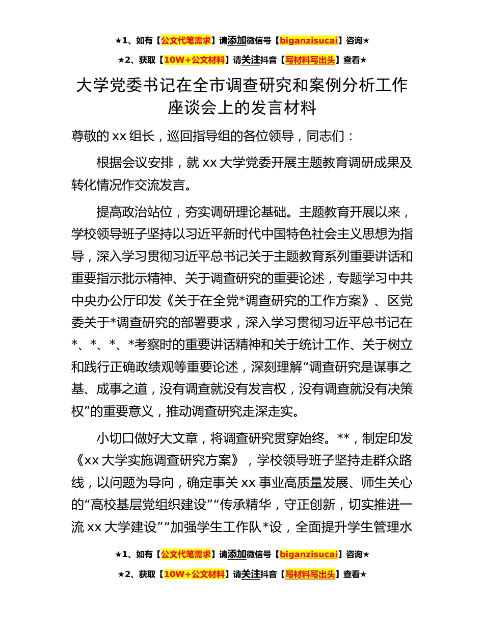 ★1、如有【公文代笔需求】请添加微信号【biganzisucai】咨询★★2、获取【10W+公文材料】请关注抖音【写材料写出头】查看★大学党委书记在全市调查研究和案例分析工作座谈会上的发言材料尊敬的xx组长,巡回指导组的各位领导,同志们:根据会议安排,就xx大学党委开展主题教育调研成果及转化情况作交流发言。提高政治站位,夯实调研理论基础。主题教育开展以来,学校领导班子坚持以习近平新时代中国特色社会主义思想为指导,深入学习贯彻习近平总书记关于主题教育系列重要讲话和重要指示批示精神、关于调查研究的重要论述,专题学习中共中央办公厅印发《关于在全党*调查研究的工作方案》、区党委关于*调查研究的部署要求,深入学习贯彻习近平总书记在*、*、*、*考察时的重要讲话精神和关于统计工作、关于树立“和...