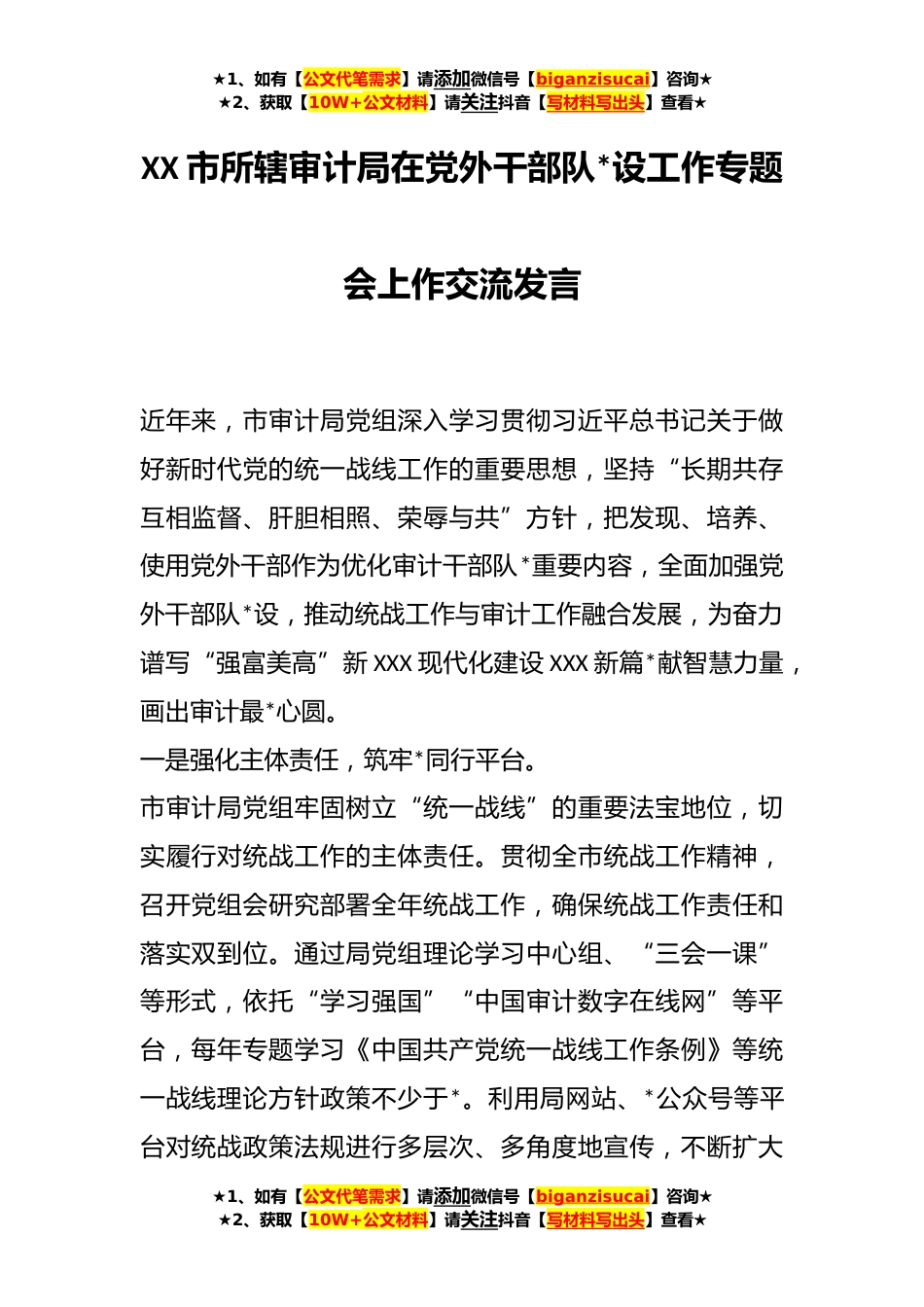 ★1、如有【公文代笔需求】请添加微信号【biganzisucai】咨询★★2、获取【10W+公文材料】请关注抖音【写材料写出头】查看★XX市所辖审计局在党外干部队*设工作专题会上作交流发言近年来,市审计局党组深入学习贯彻习近平总书记关于做好新时代党的统一战线工作的重要思想,坚持“长期共存互相监督、肝胆相照、荣辱与共”方针,把发现、培养、使用党外干部作为优化审计干部队*重要内容,全面加强党外干部队*设,推动统战工作与审计工作融合发展,为奋力谱写“强富美高”新XXX现代化建设XXX新篇*献智慧力量,画出审计最*心圆。一是强化主体责任,筑牢*同行平台。市审计局党组牢固树立“统一战线”的重要法宝地位,切实履行对统战工作的主体责任。贯彻全市统战工作精神,召开党组会研究部署全年统战工作,确保统战工...